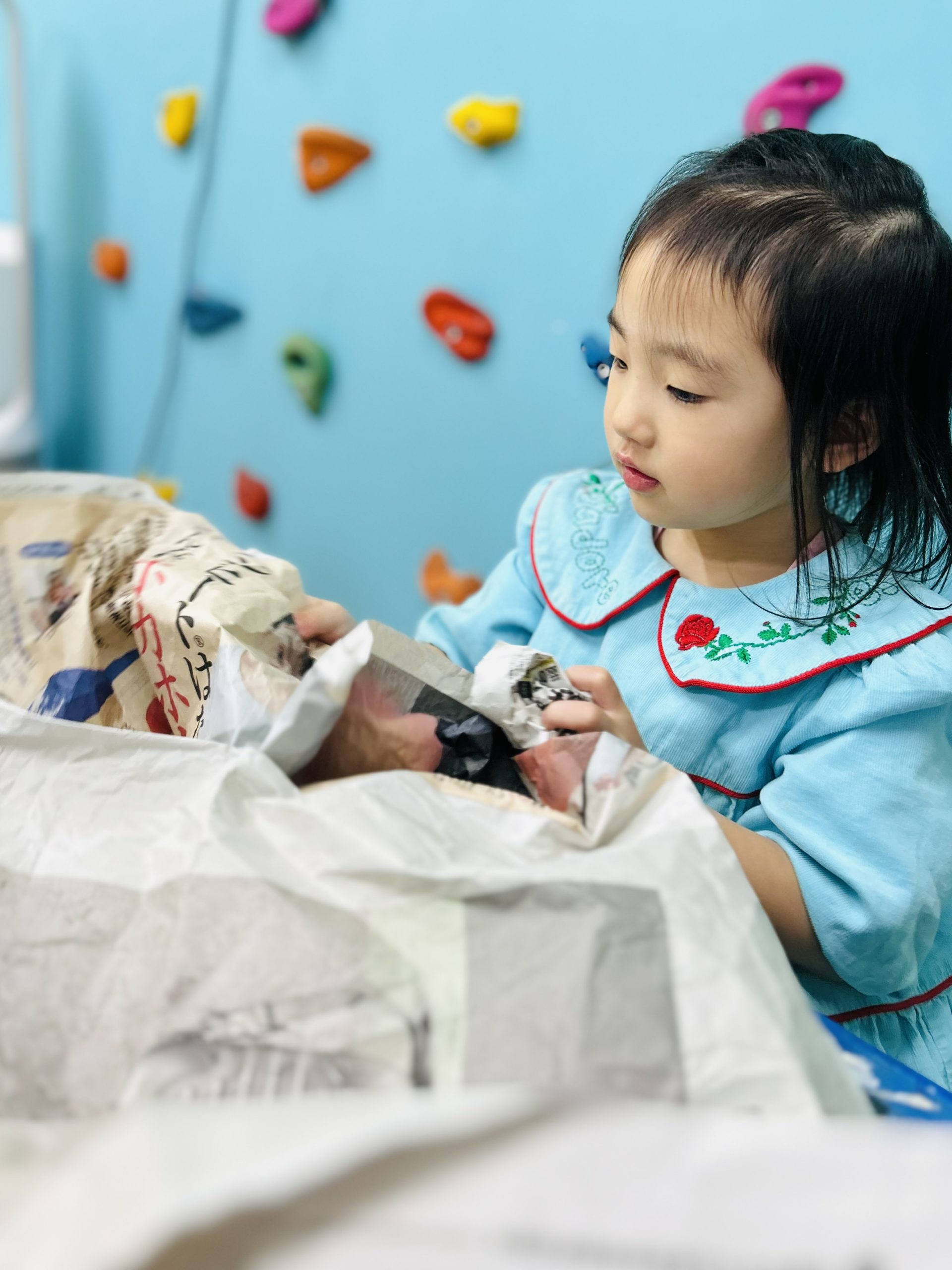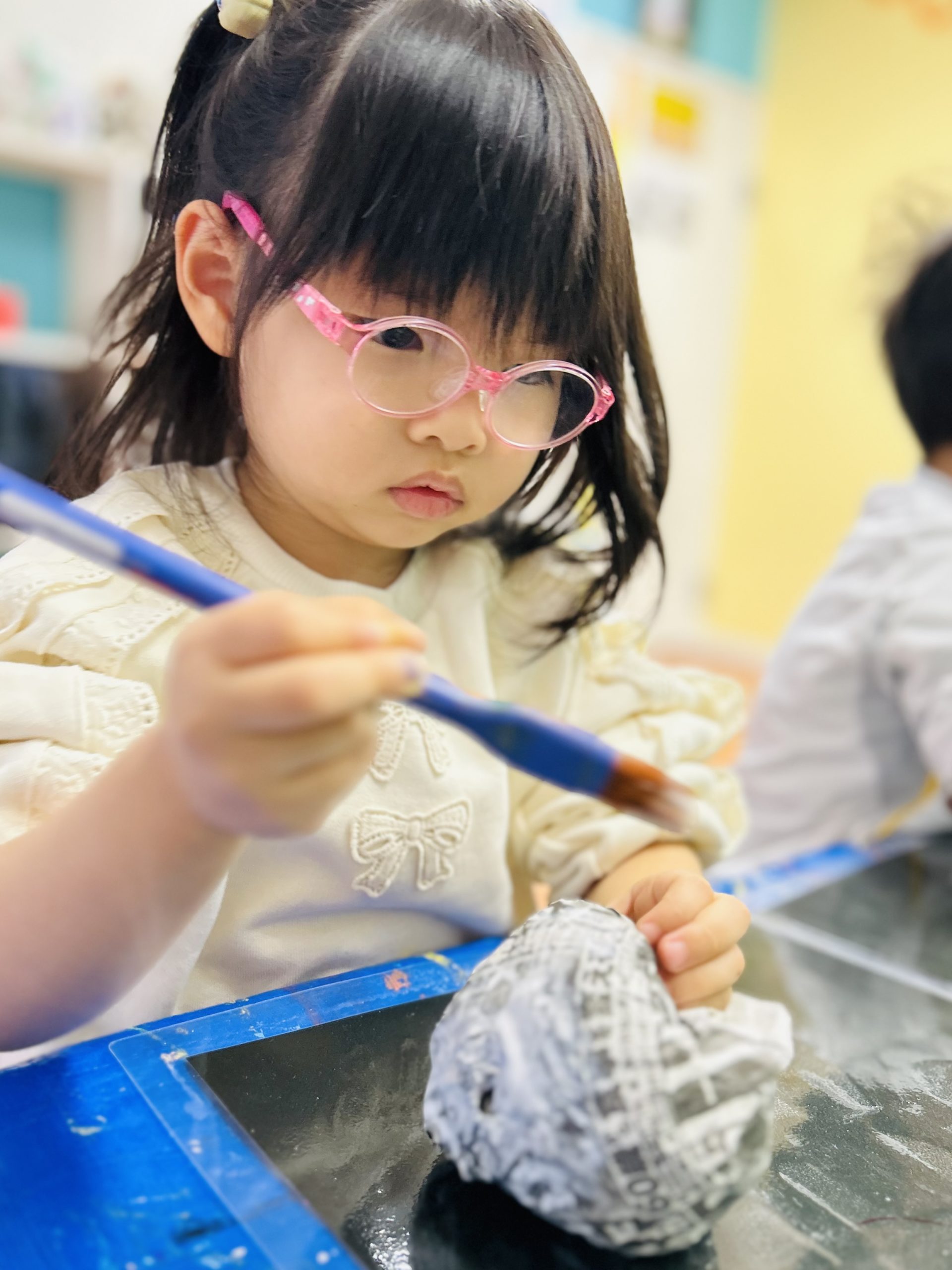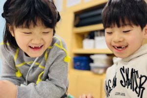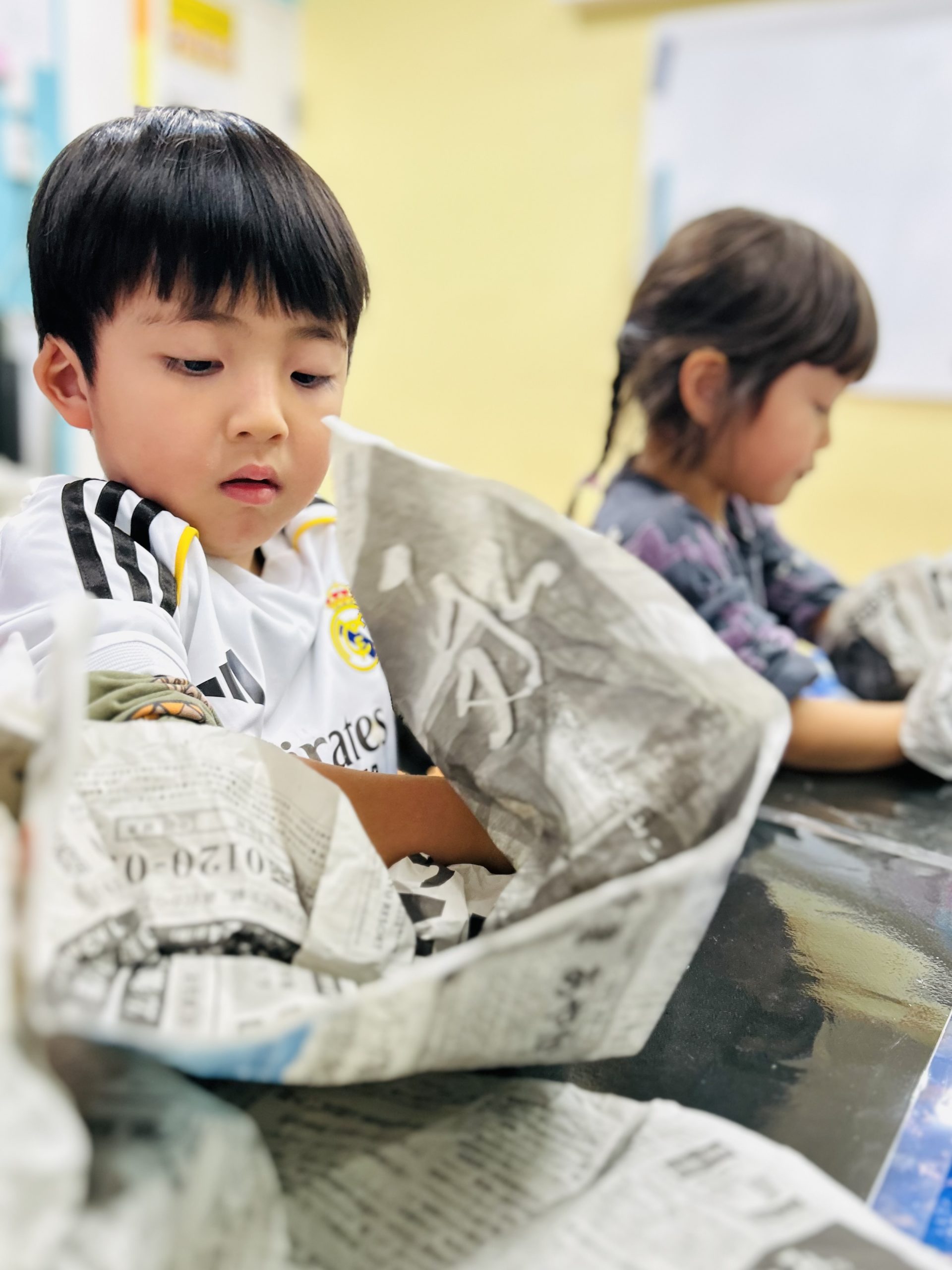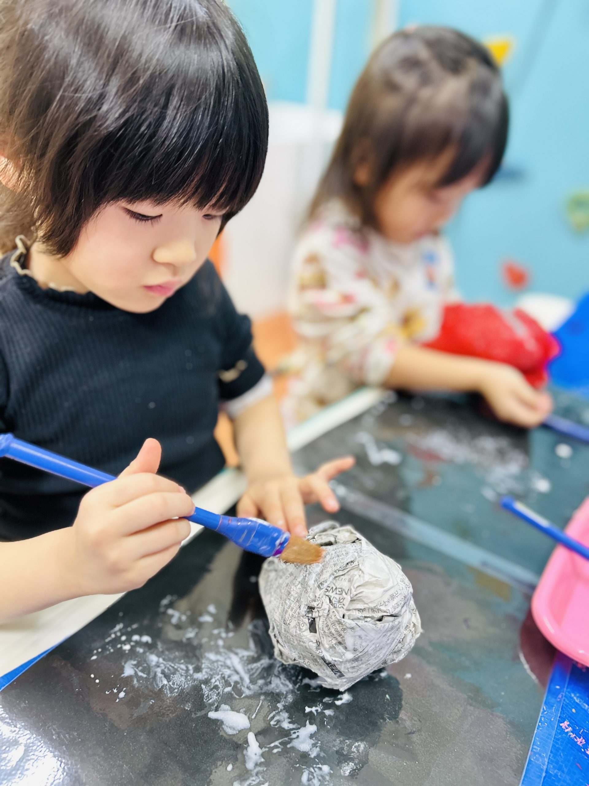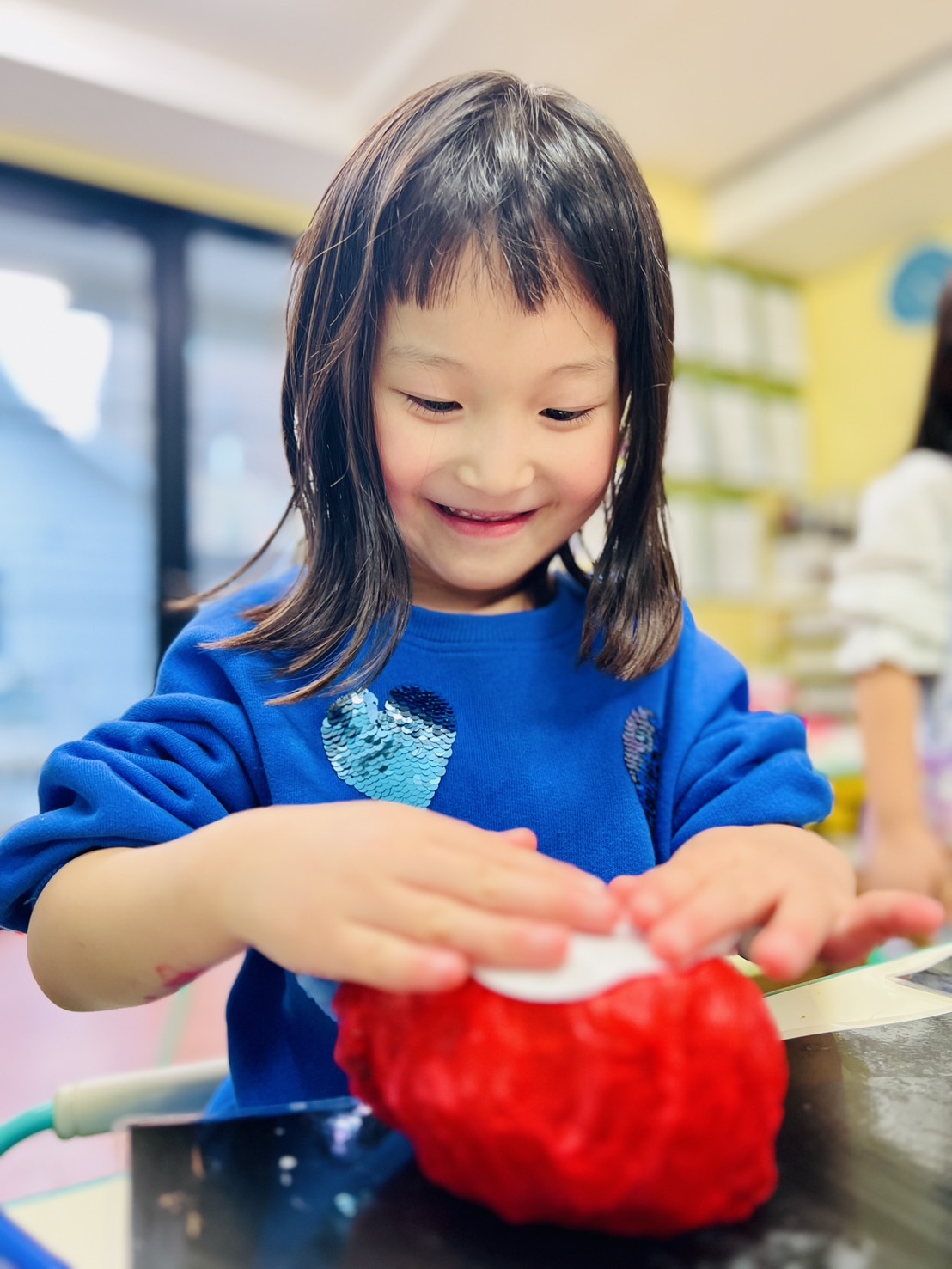 年少さんはDaruma dollとDoraemon(ドラえもん)が混ざってしまい、作業をしながら、だるまとドラえもんの違いを少し考えました。