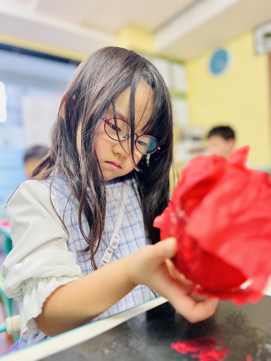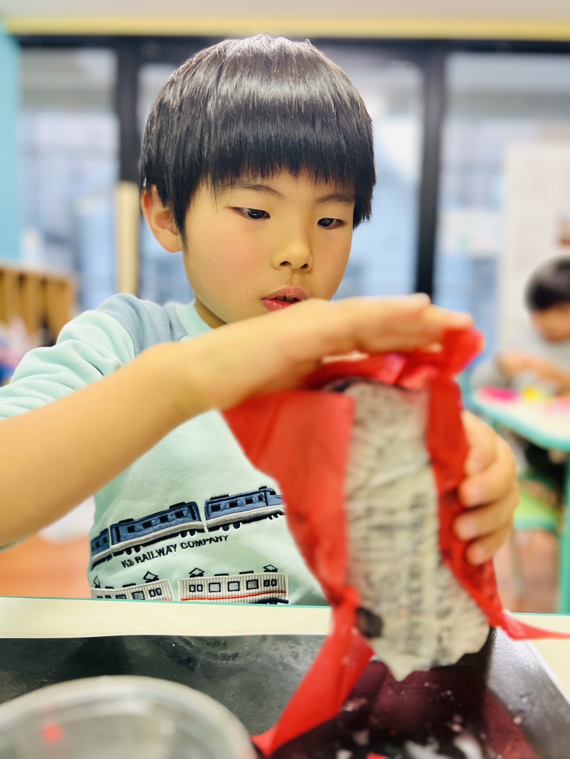 そして、糊が乾かないうちに赤いお花紙を貼りました。