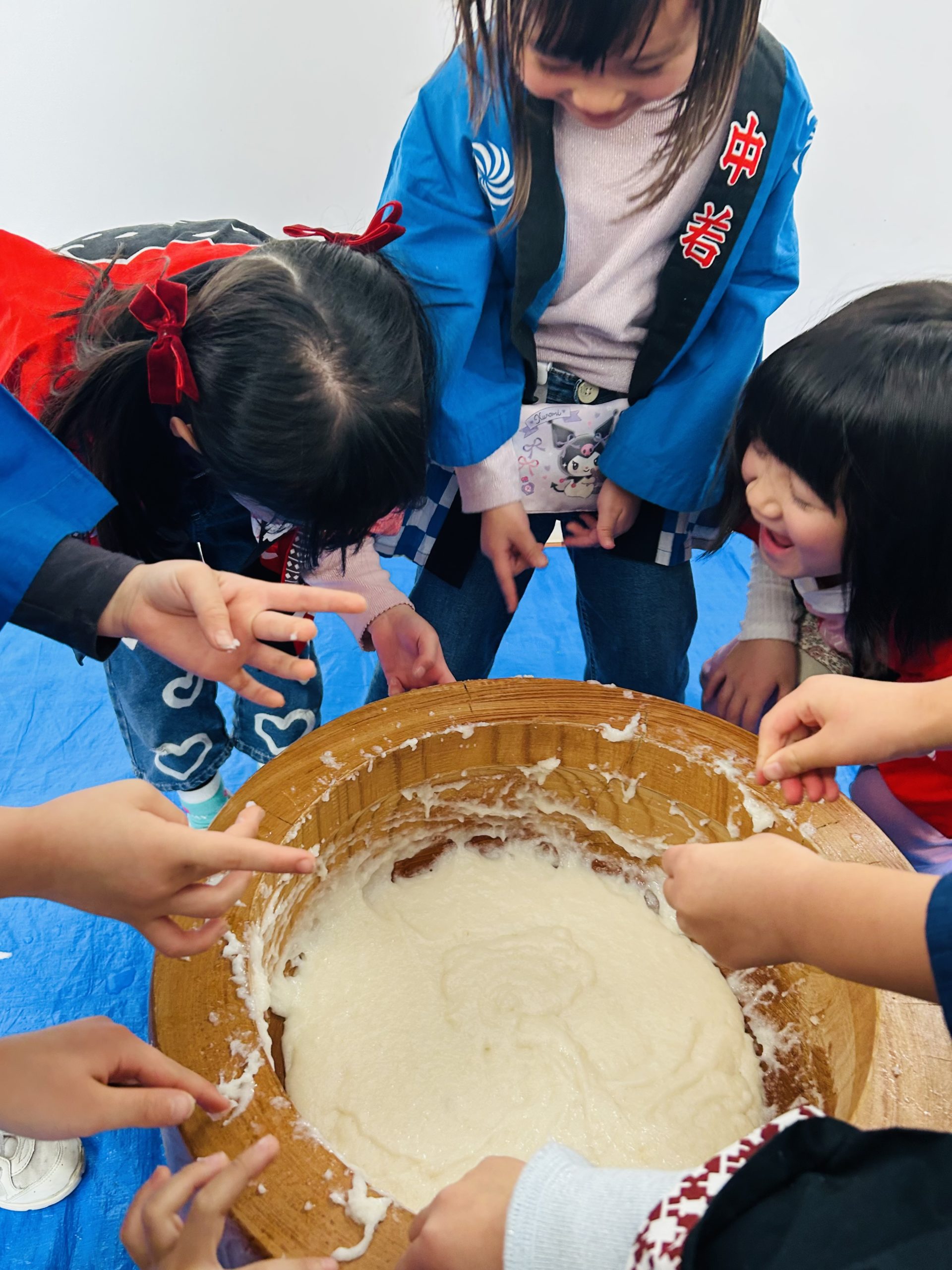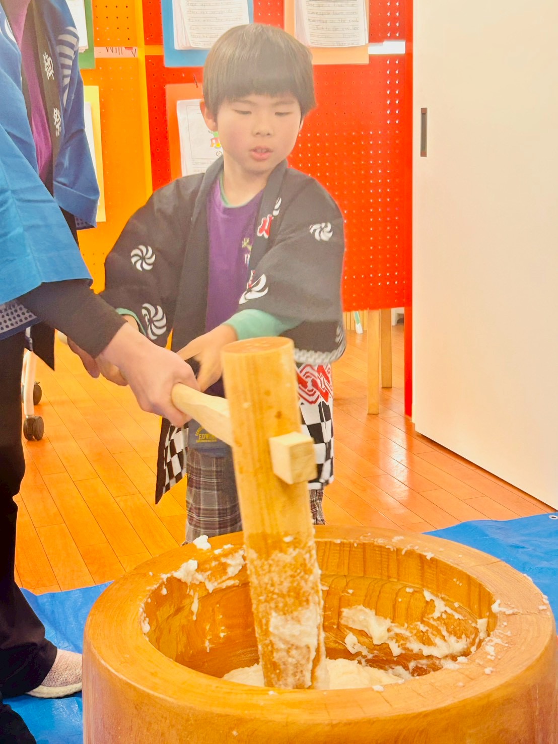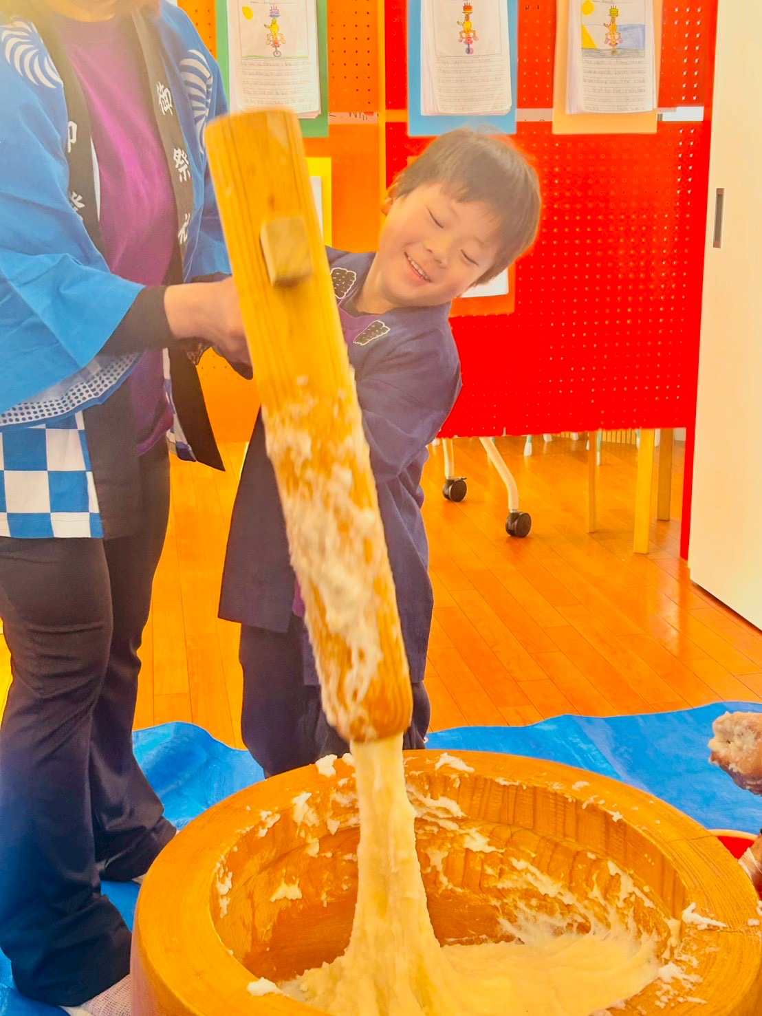 先生と一緒に力を合わせてついたお餅は、びよーんと伸びて子どもたちは大盛り上がりでした。