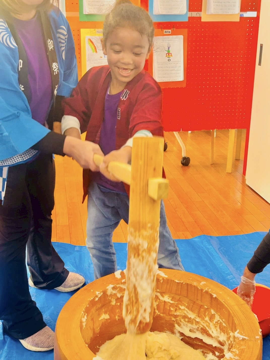 杵を持ってお餅をつくと、「One, two, three!」と元気な掛け声が響き、みんなの気持ちもひとつになりました。