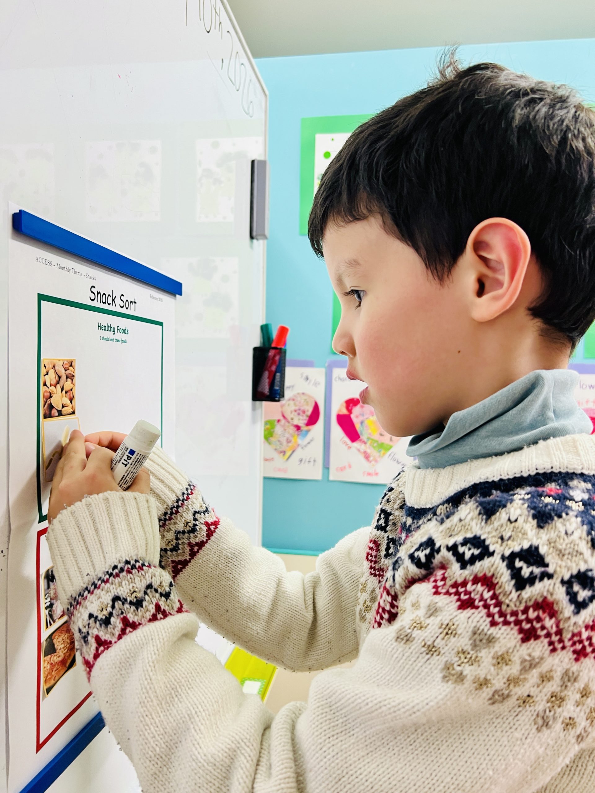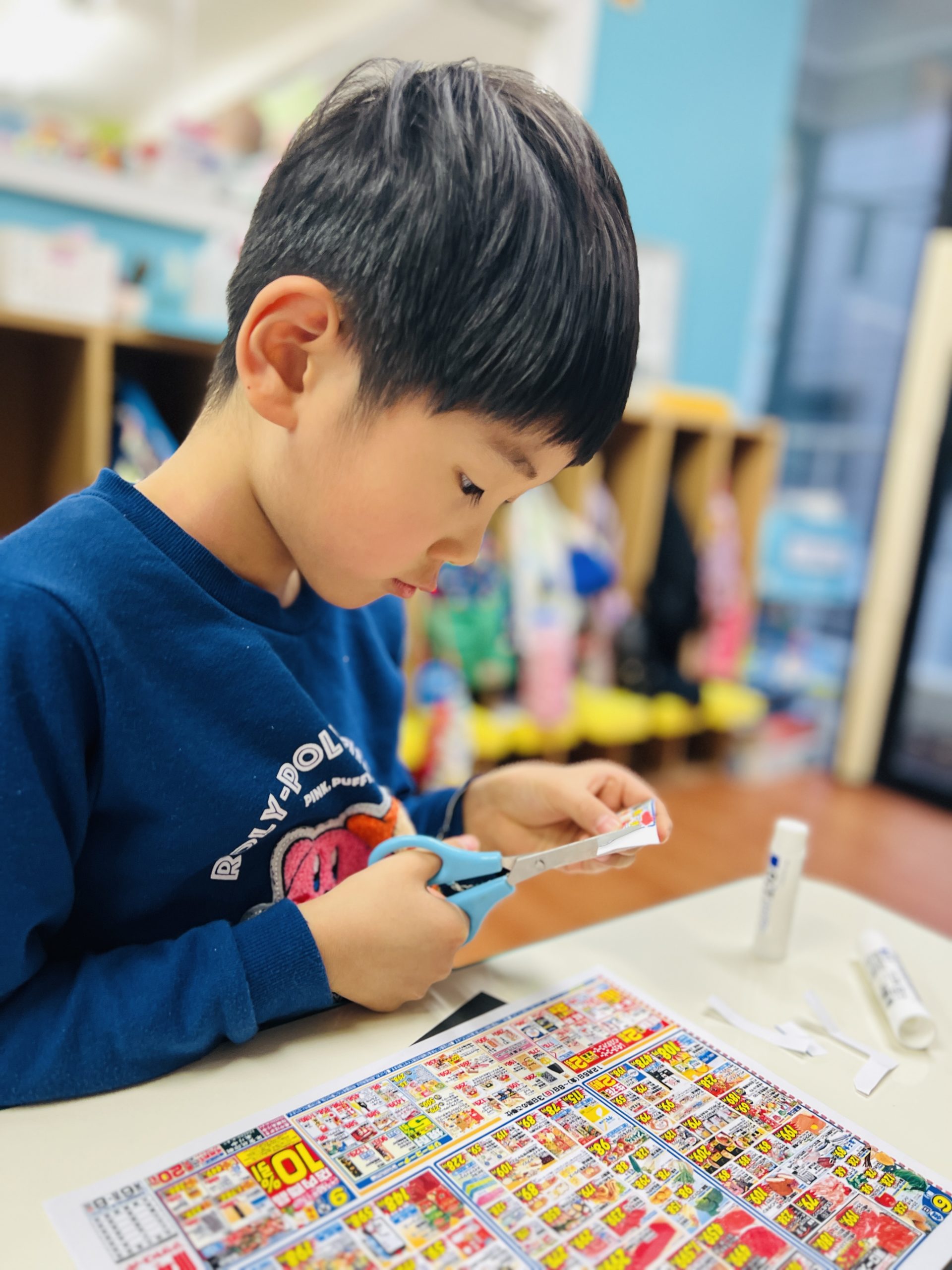 スーパーのチラシの中から自分たちで食べ物を探し、切り抜いて仕分けました。