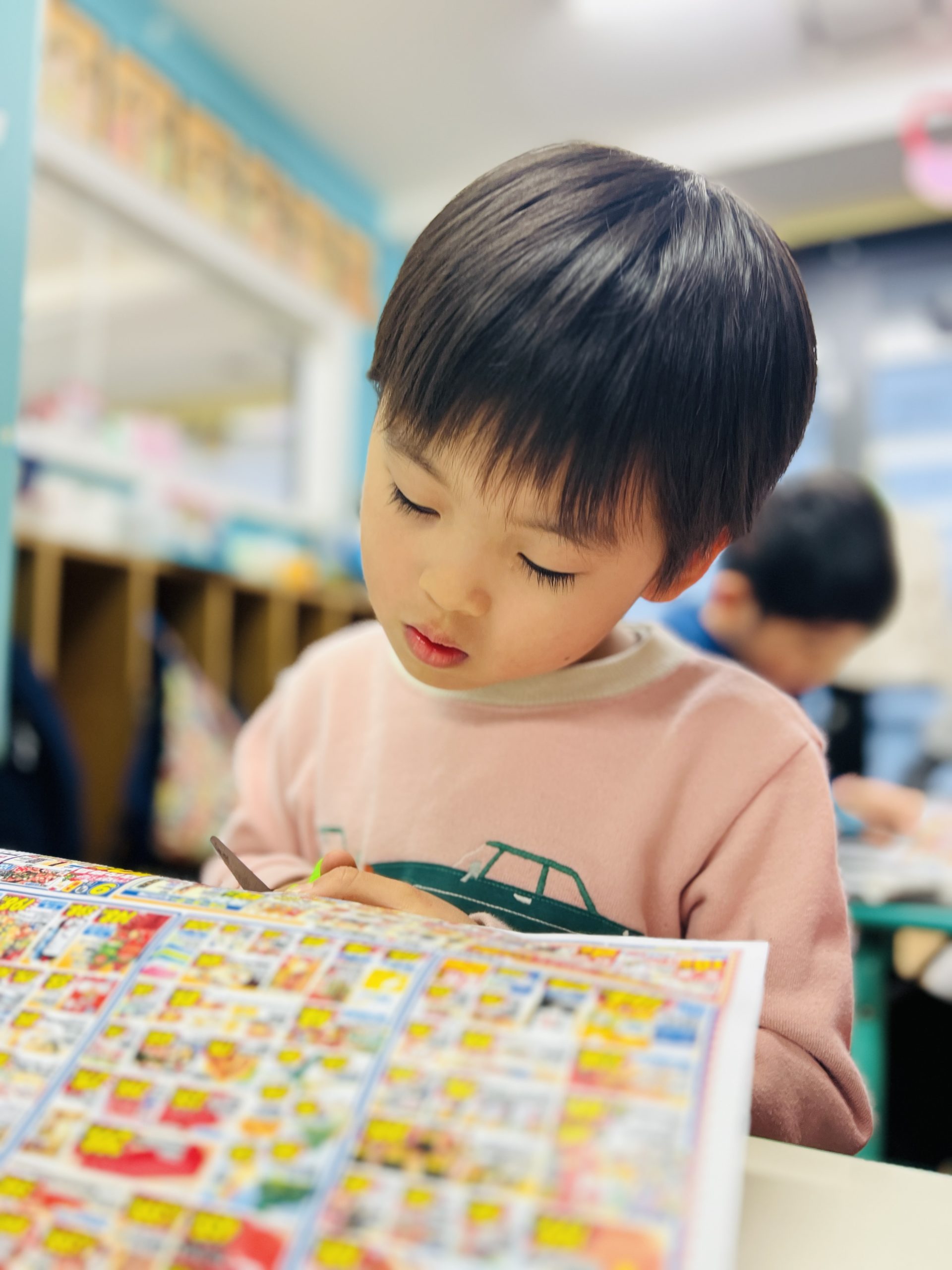 チラシを隅々までチェックする子どもたちは真剣そのもの!「これは歯が悲しむかな?」「これはハッピーだね!」と、楽しみながら健康な体や歯について考えることができました。