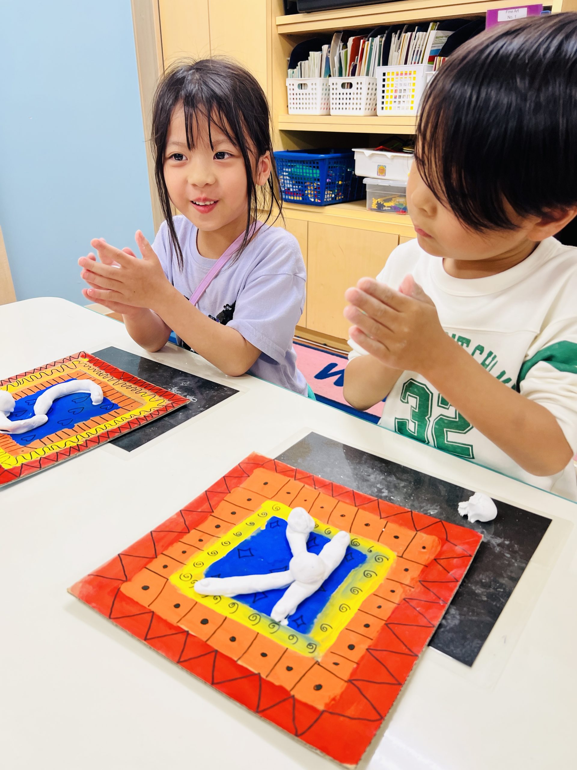 前回、正方形の段ボールに色を塗って準備していたベースを使って、いよいよアートを仕上げていきました。