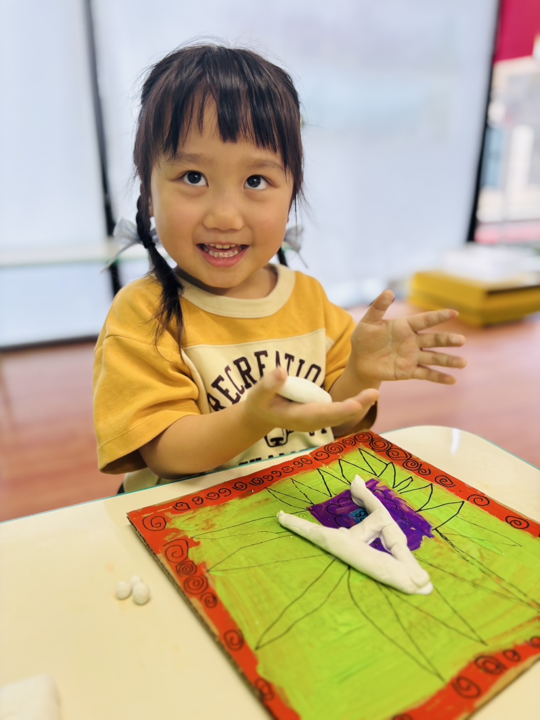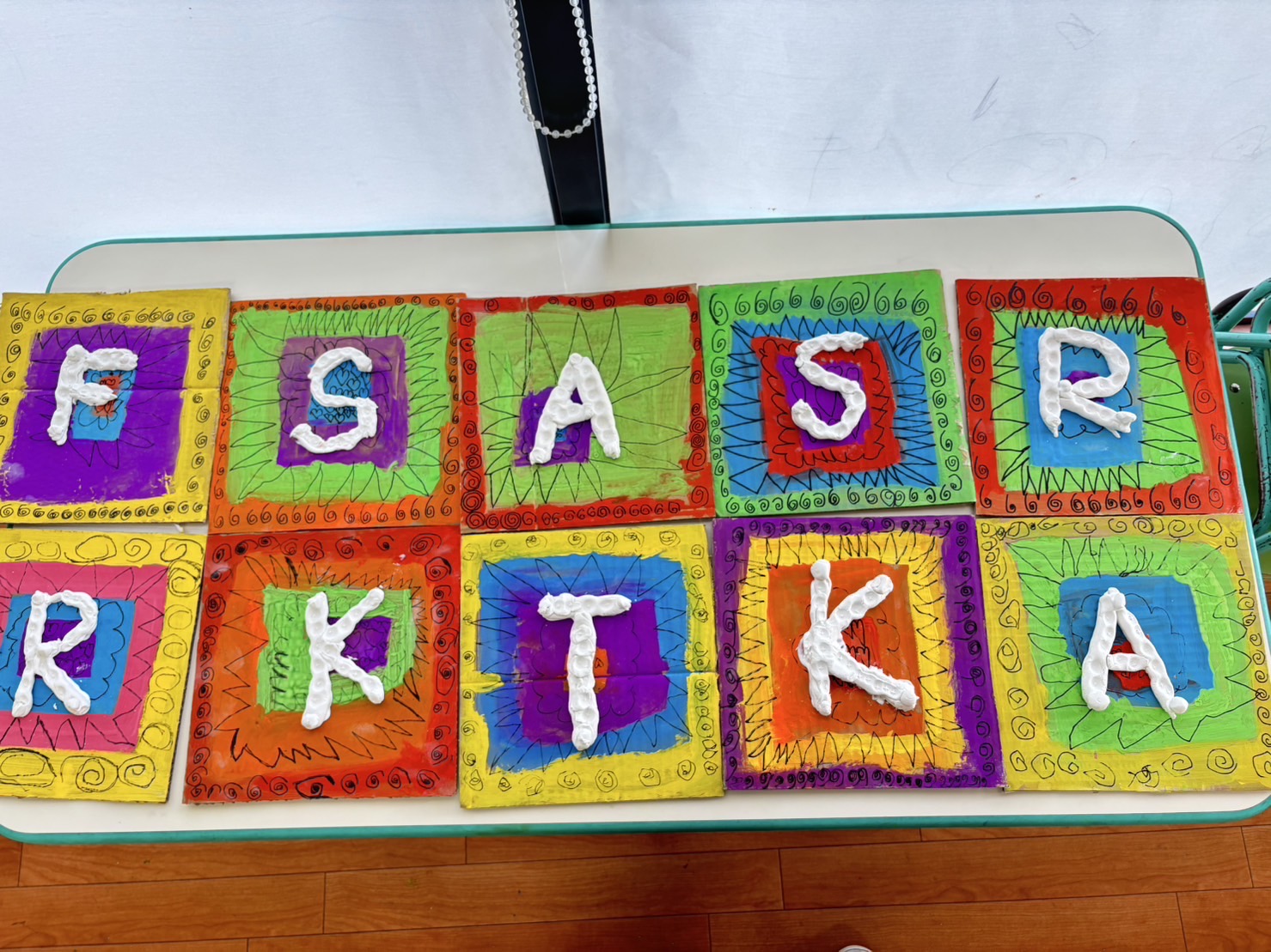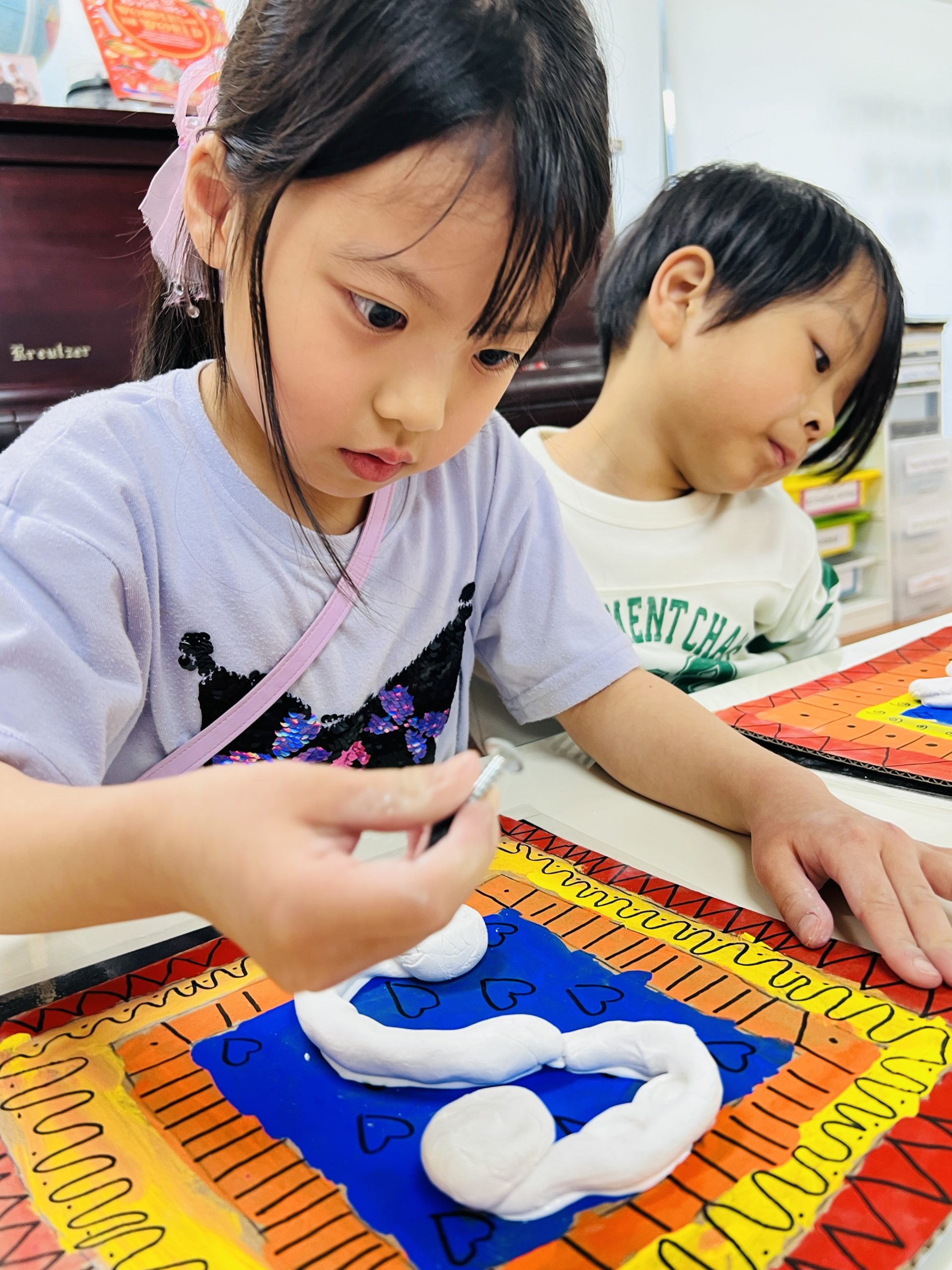 作品の主役は、自分の名前の最初の文字「イニシャル」です。粘土をこねて形を作り、ボードの真ん中に力強く貼り付けました。