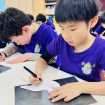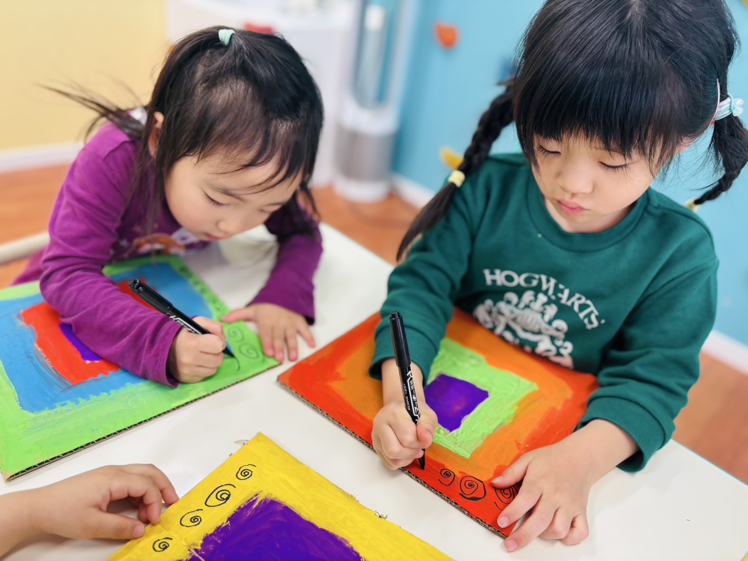 色を塗ったベースの上に、マーカーで模様を描き込みました。「ぐるぐる」の渦巻きや「四角」の連続など、思い思いのパターンで背景がどんどん賑やかに!