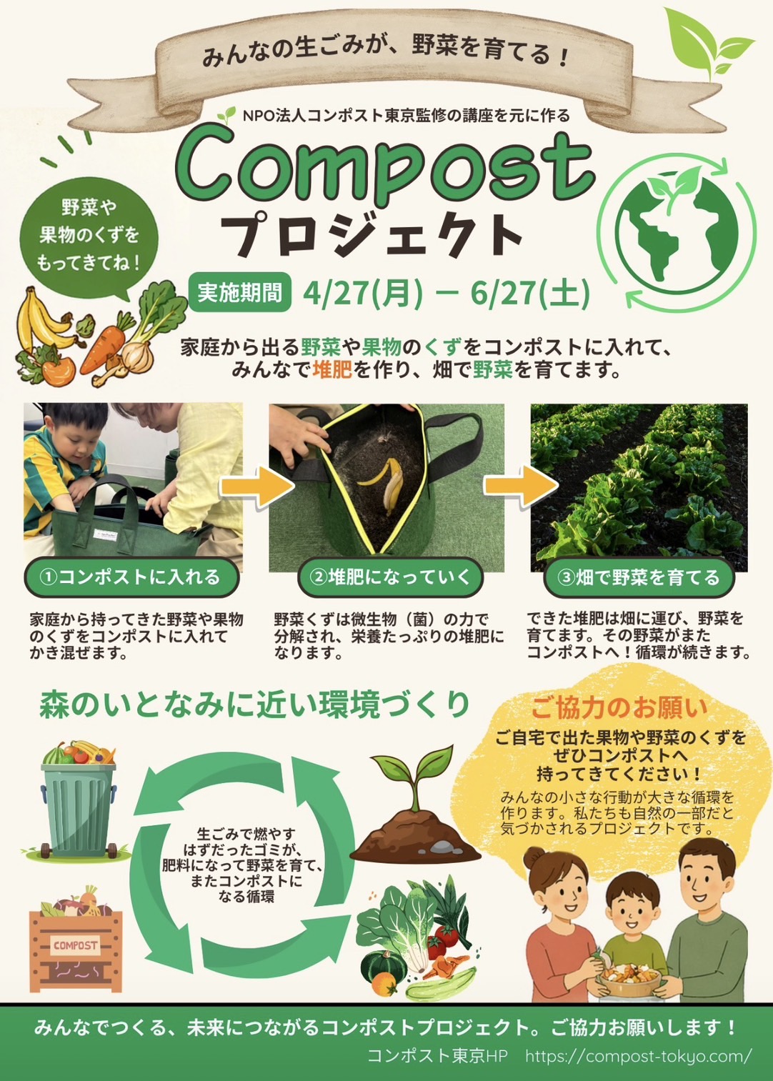 このプロジェクトをより豊かな学びにするために、ご家庭で出た「野菜や果物のくず(皮やヘタなど)」をぜひスクールにお持ち寄りください!