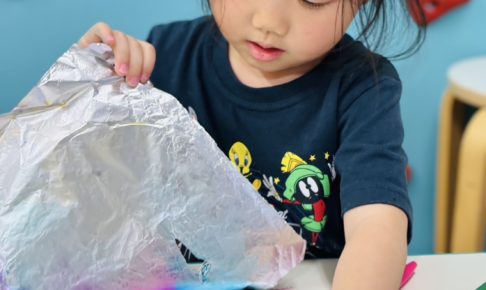今日のアートのテーマは、春を彩る「綺麗なお花」。 少しユニークな技法を使って、幻想的なタイダイ(絞り染め)模様のお花作りに挑戦しました! まずは画用紙いっぱいに、元気なお花の形を描きます。 次に、アルミホイルをパレットに…