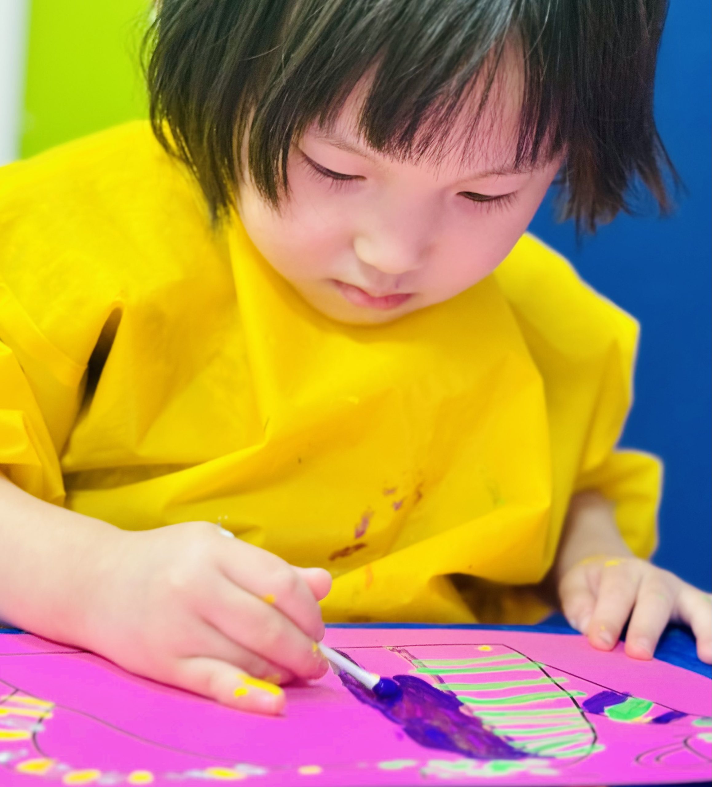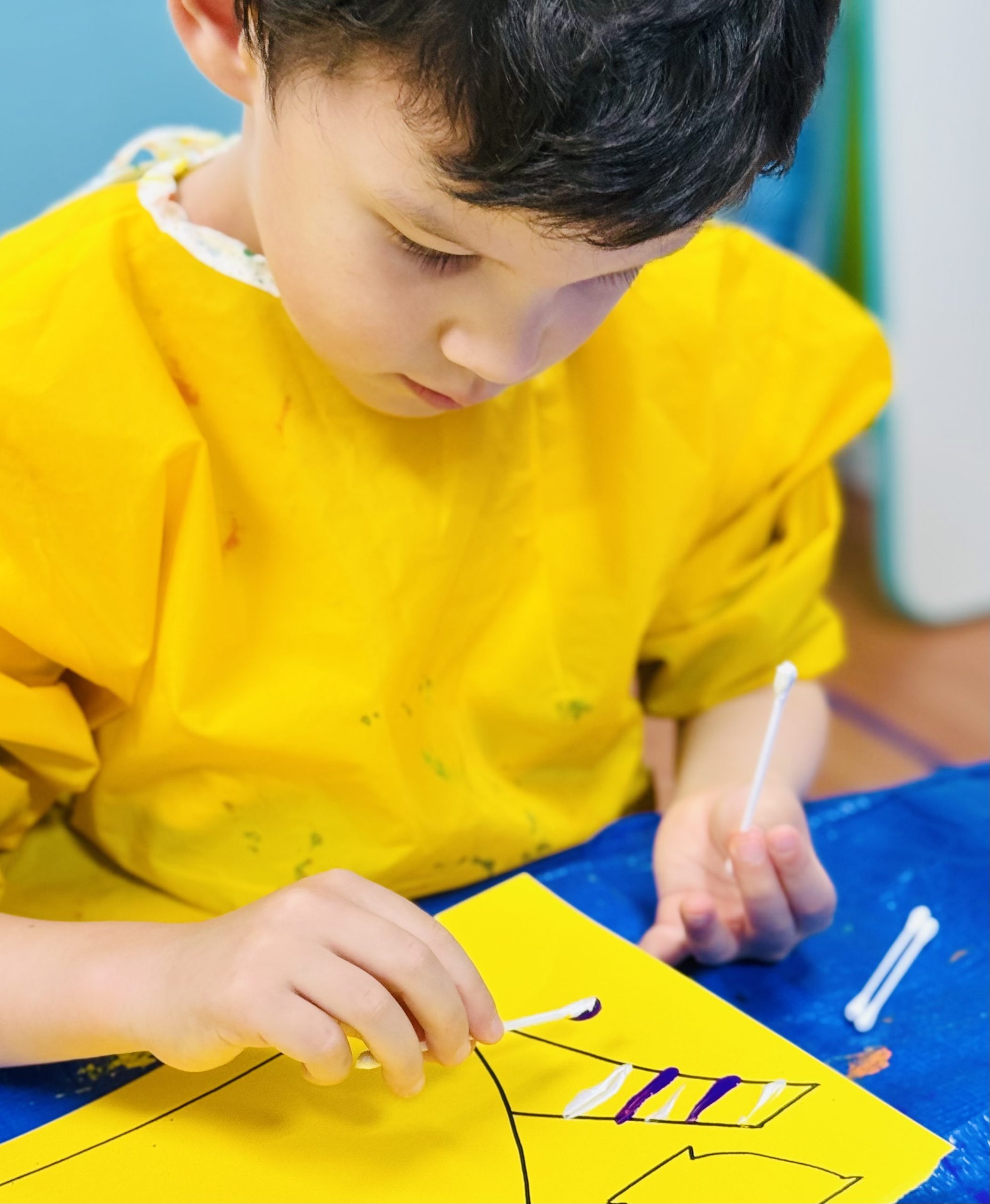 子ども達は絵の具を使い、色鮮やかで個性あふれる作品を作っています。こちらでは、綿棒を使ってデザインしていますね。