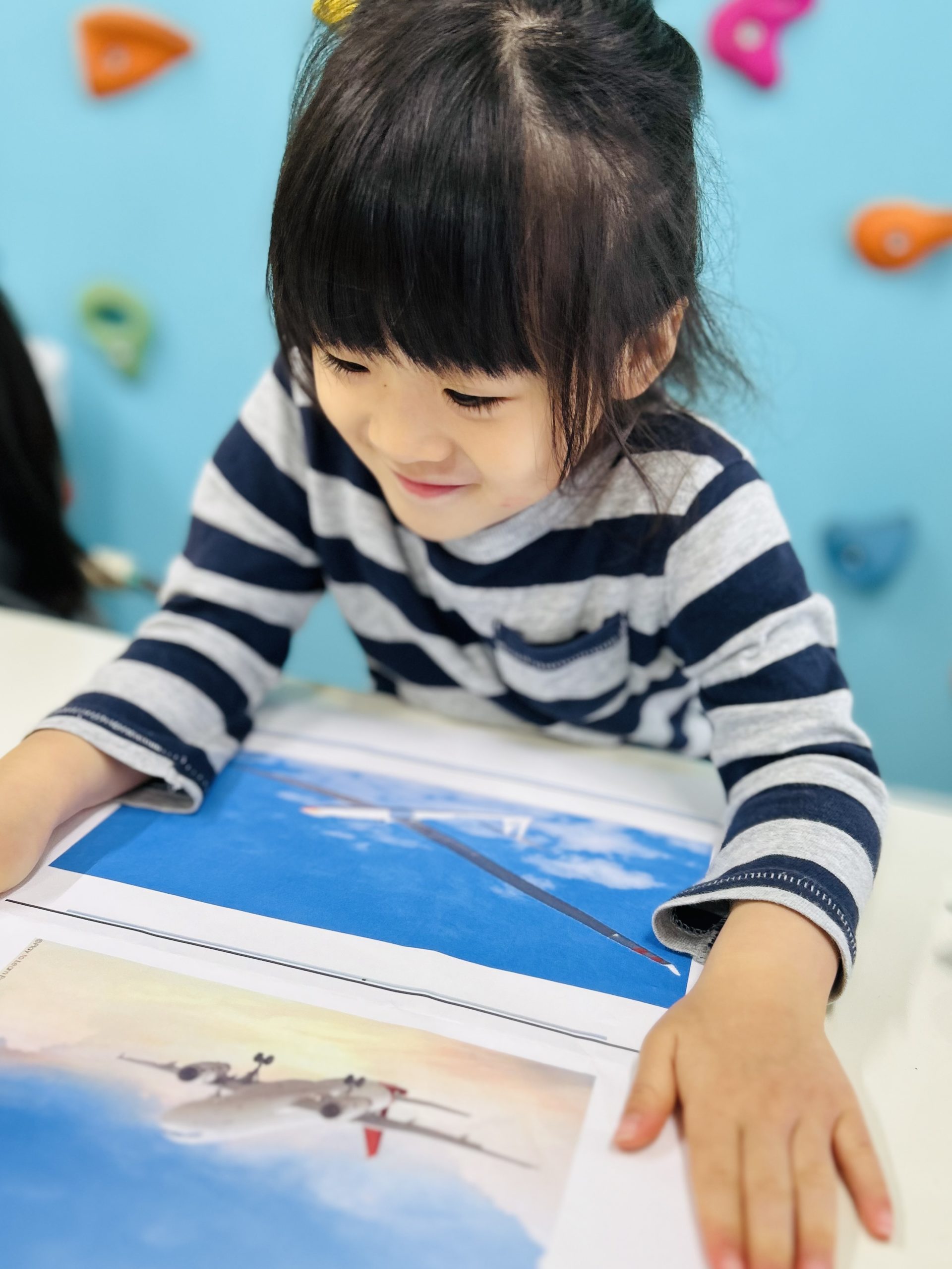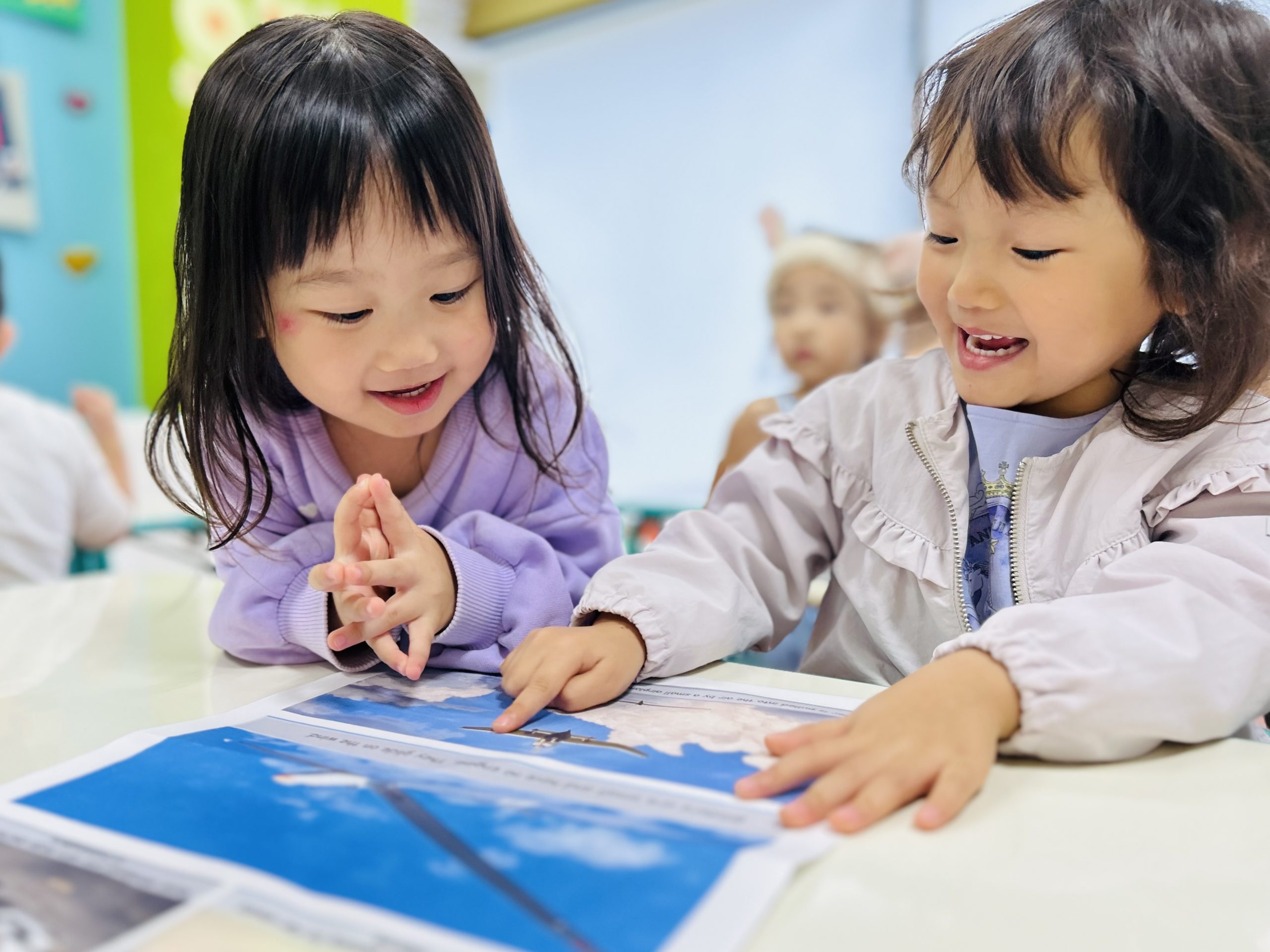 写真を見ながら「これは飛行機!」と、お友だち同士で楽しそうに会話を広げていました。
