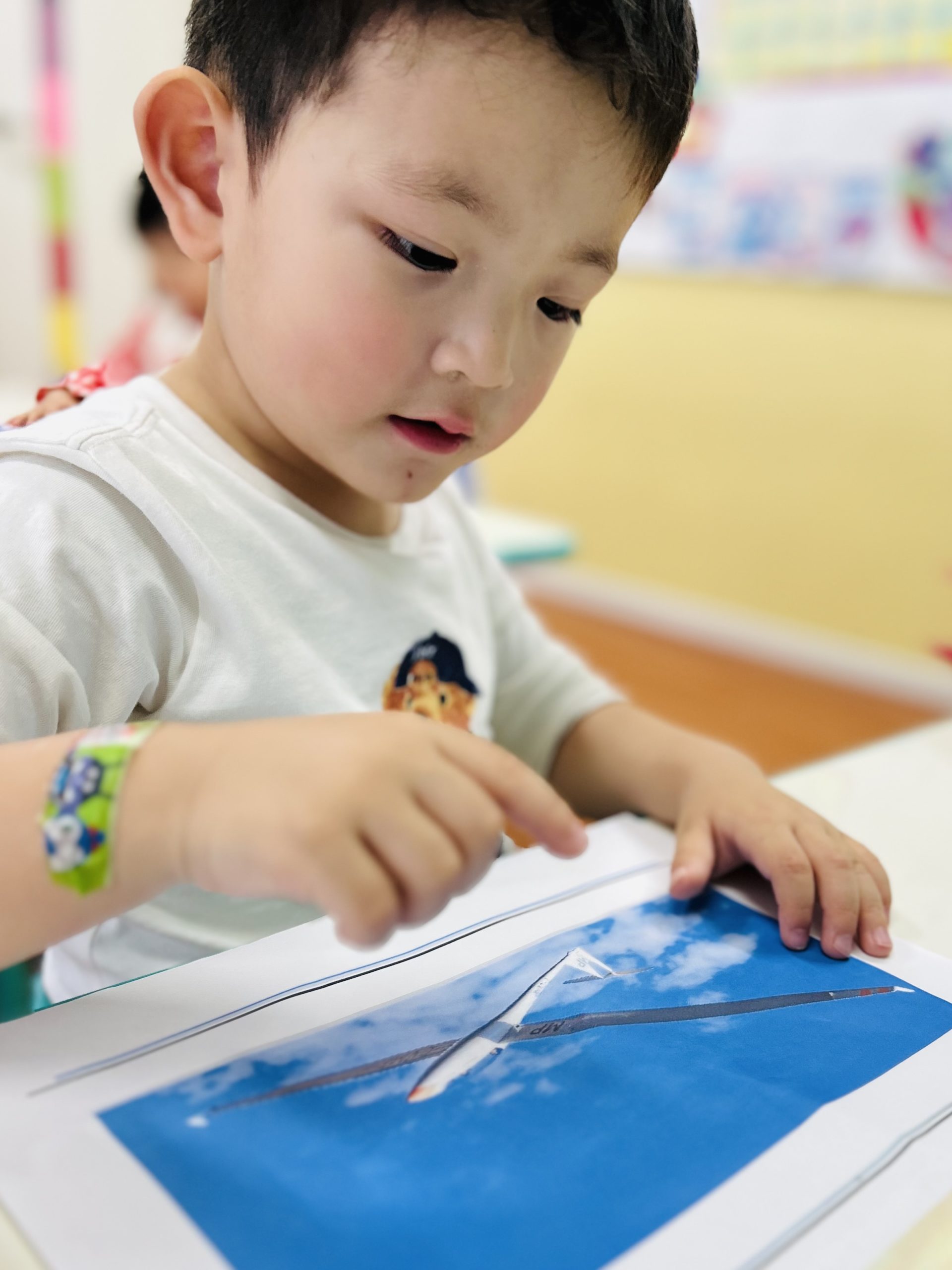 5月の毎週火曜日は、「乗り物」について学んでいます。空を飛ぶ飛行機や、海の上を走る船など、子どもたちはさまざまな乗り物に興味津々!