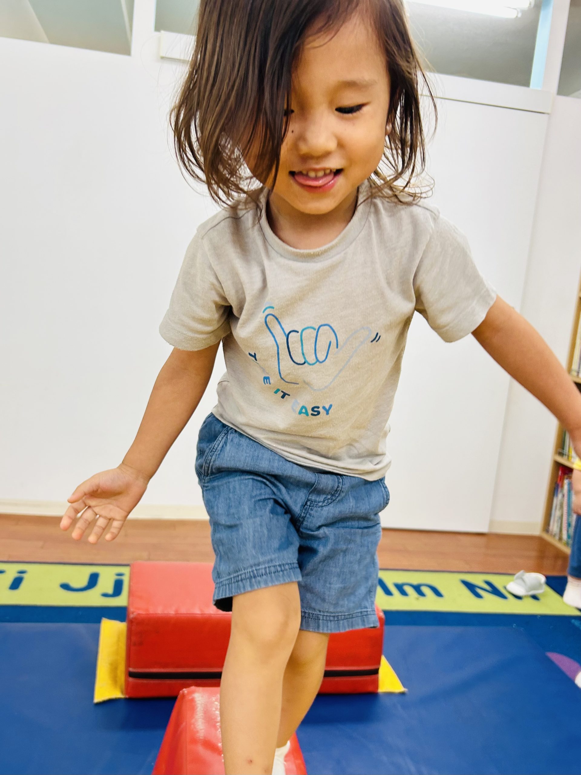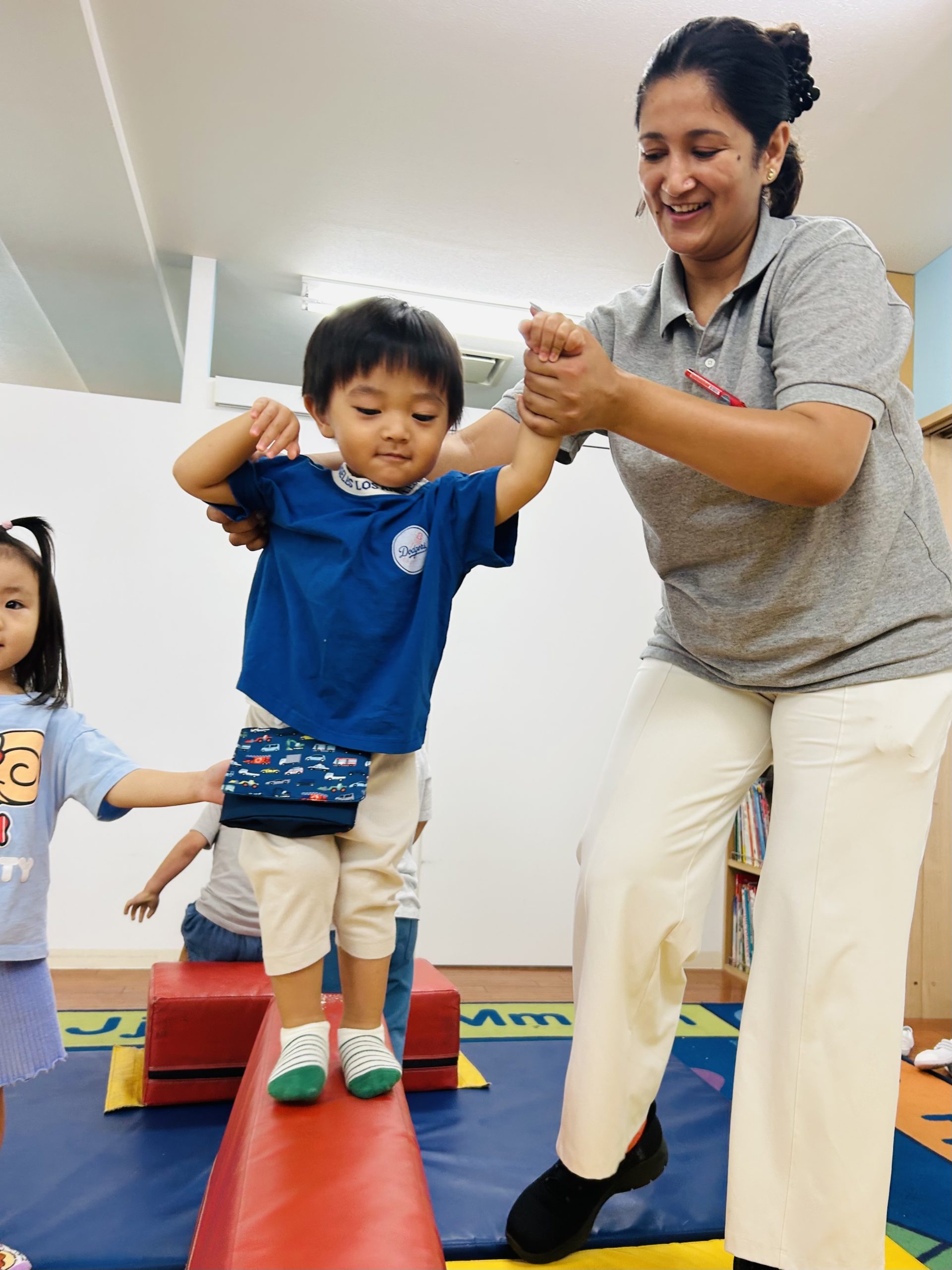 今日は1、2歳児クラスは平均台やマットを使って体を動かしました!