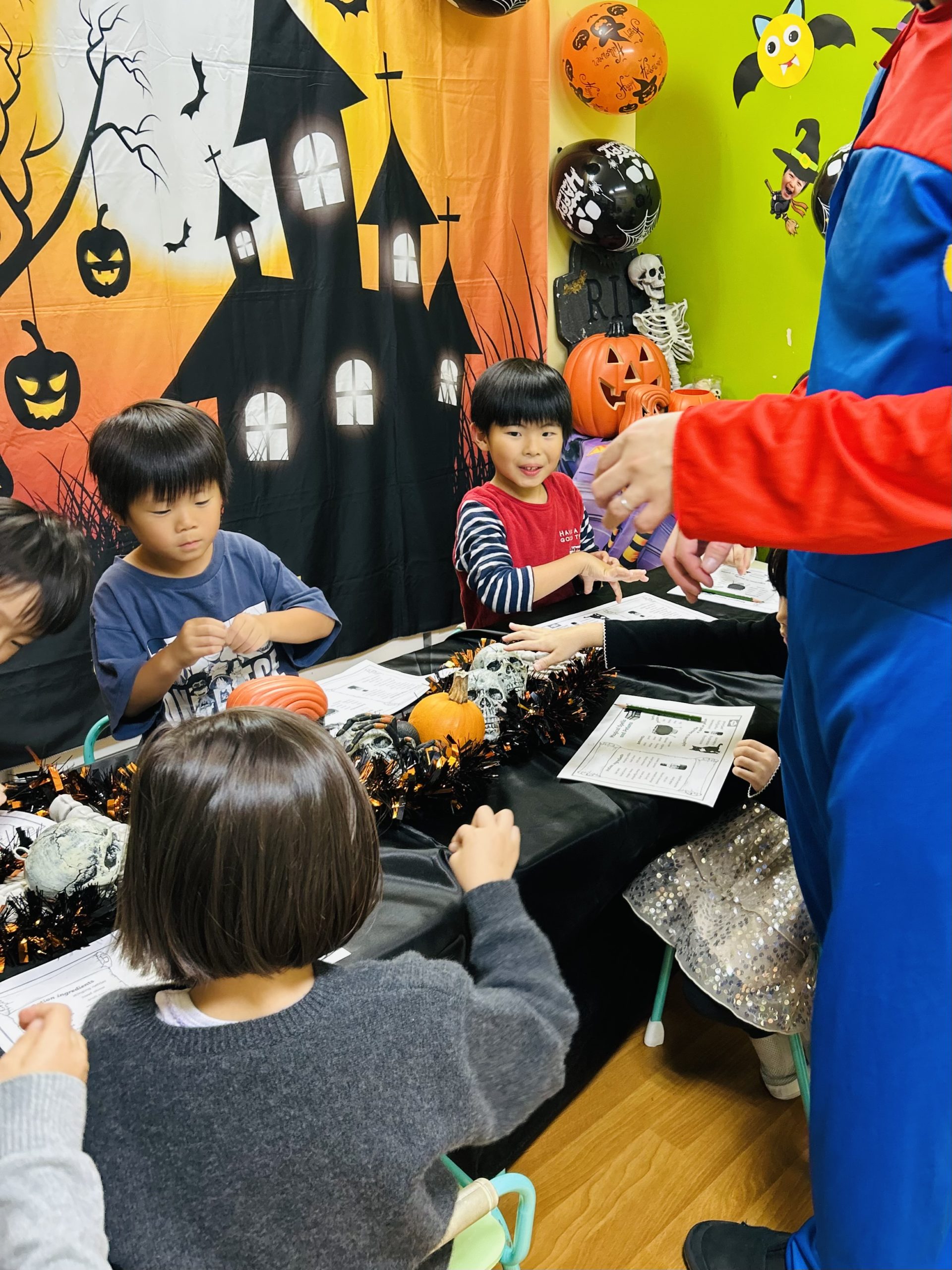 オオカミやピエロに変身したお友だちもいて、教室中が笑い声でいっぱいになりました。