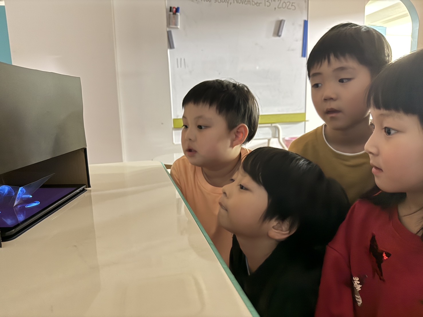 実際に映し出される立体的な映像に、子どもたちは興味津々の様子でした。