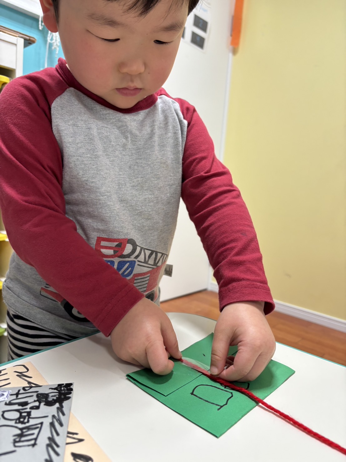 ポストから溢れる表現をするために、ポスト入れる前にひと工夫凝らしましょう!毛糸にみんなの手紙をどんどんつけていきます。