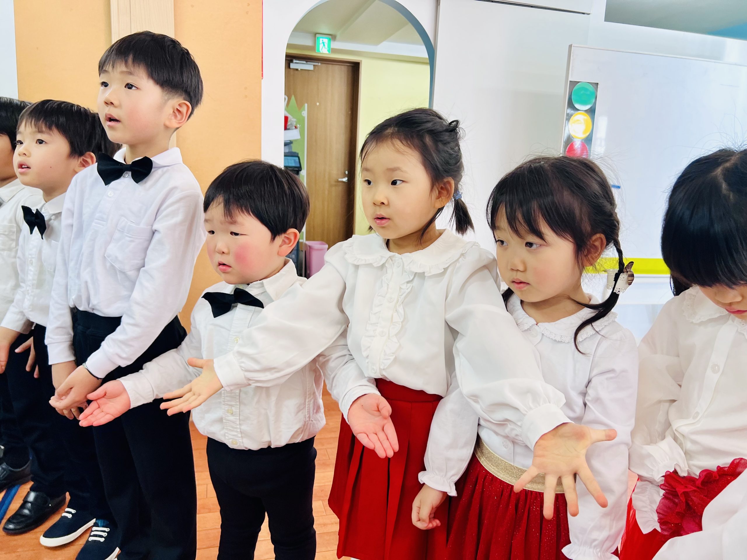 今日は、P2クラスからK3クラスまで、みんなで本番の素敵なドレスや衣装を着て、初めての通し練習を行いました。