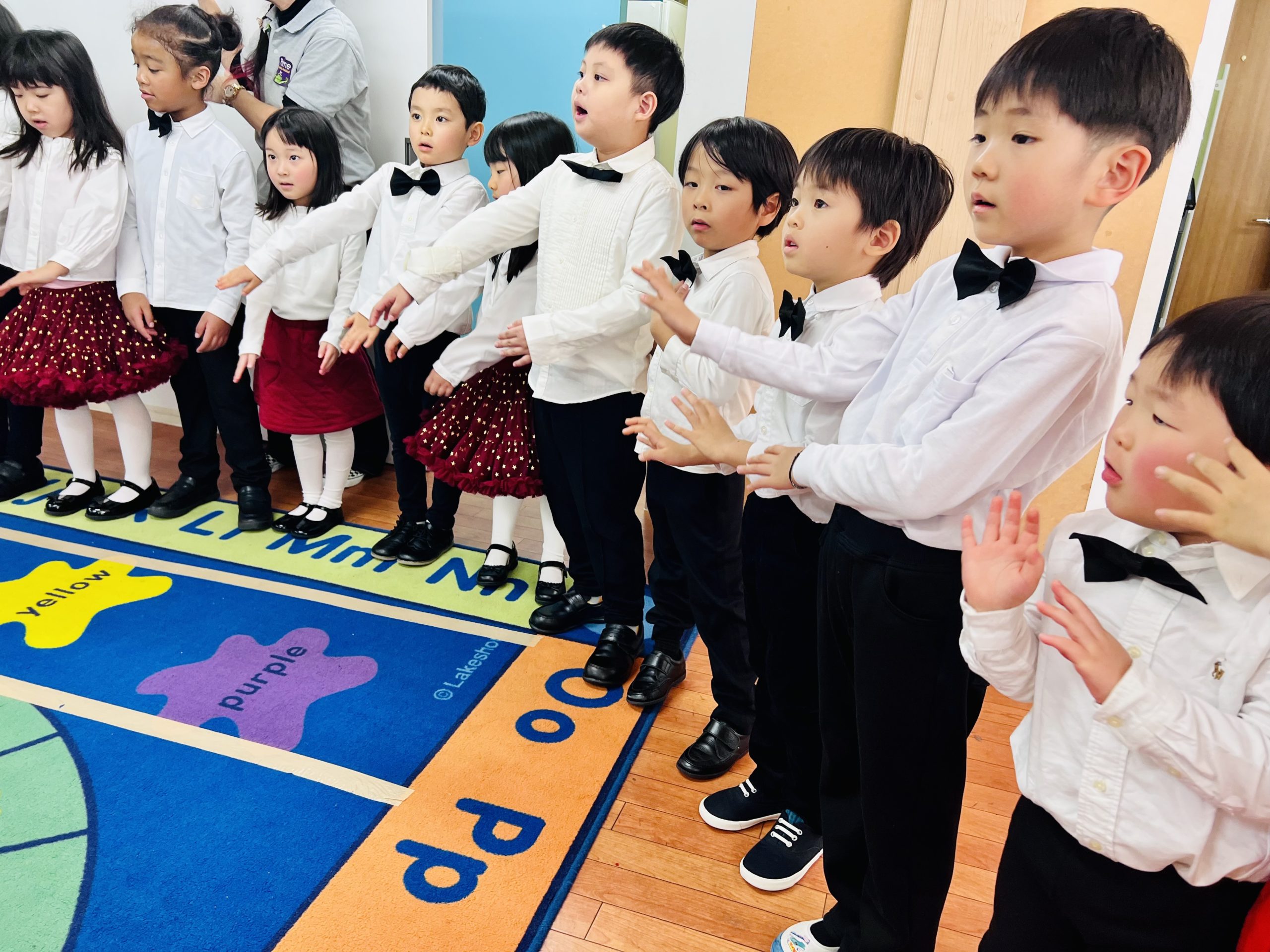 今日は、P2クラスからK3クラスまで、みんなで本番の素敵なドレスや衣装を着て、初めての通し練習を行いました。