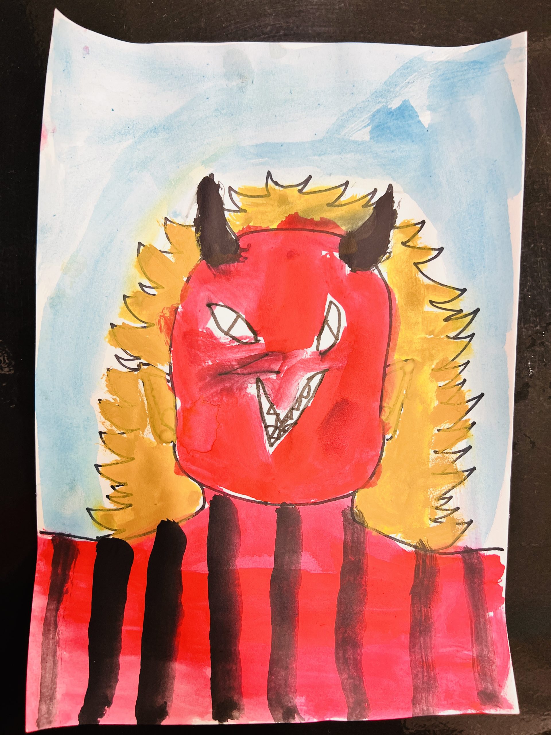 「どんな顔が怖いかな?」と想像しながら、鋭い角や大きな口を描き込み、最後は絵の具でダイナミックに色付け!一人ひとり表情が違う、迫力満点の鬼たちが完成しました。
