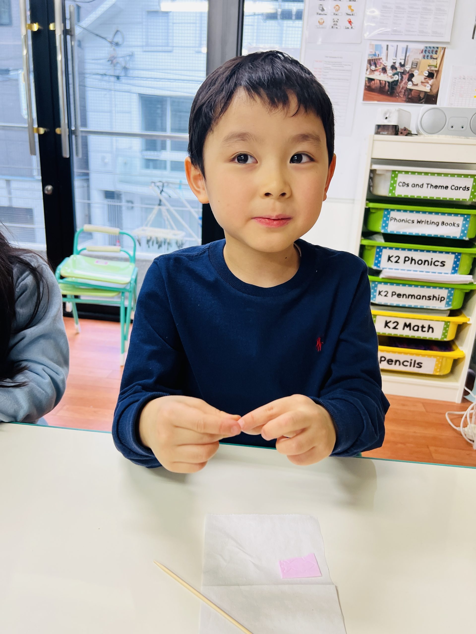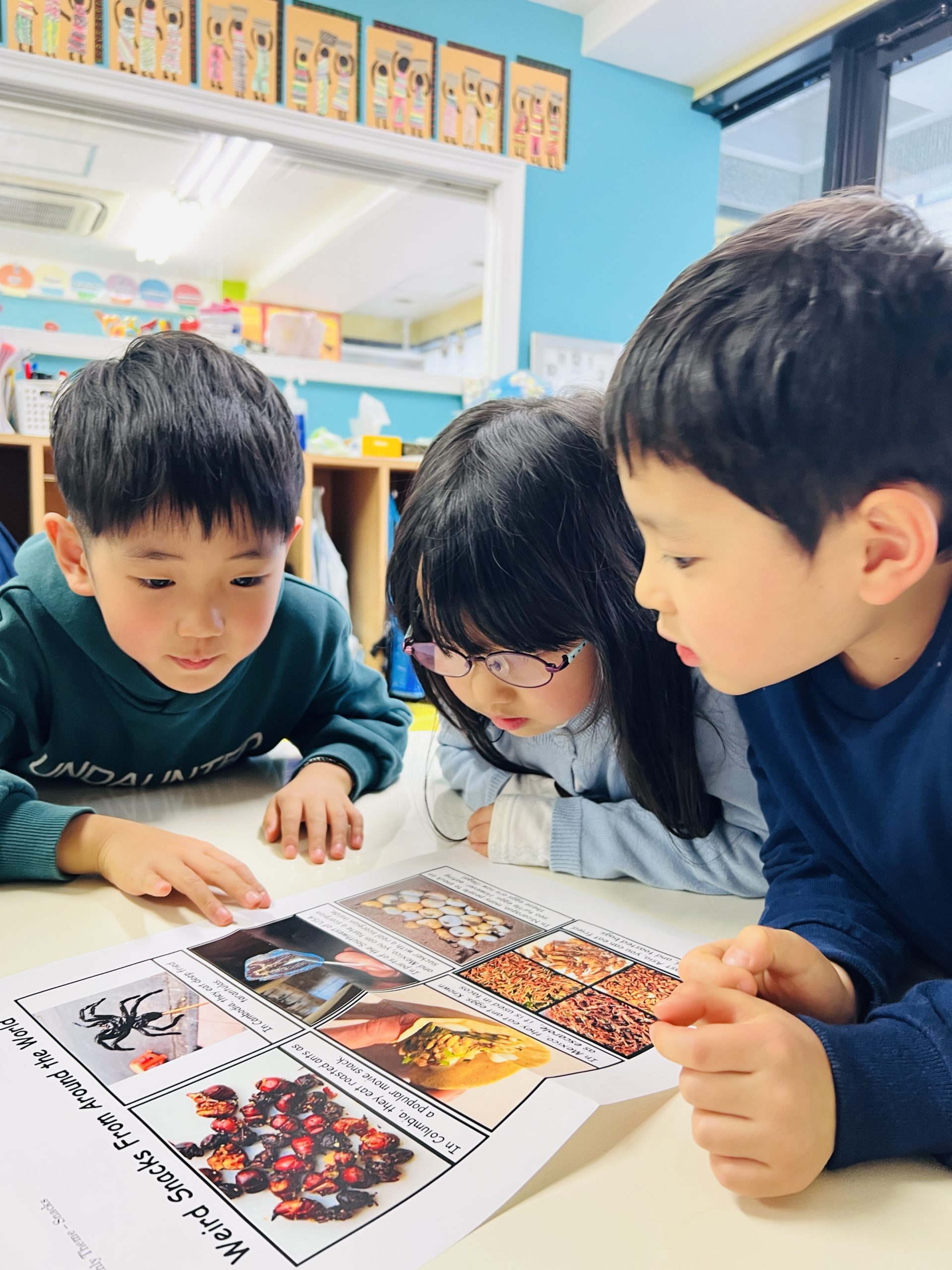コロンビアの「焼きアリ」や、カンボジアの「クモの素揚げ」など、驚きのラインナップに子どもたちは釘付け!「どれなら食べてみたい?」とみんなでワクワクしながら投票を行いました。自分たちのお気に入りのお菓子や、海外で食べた不思議な味についても、楽しくお話ししてくれました。