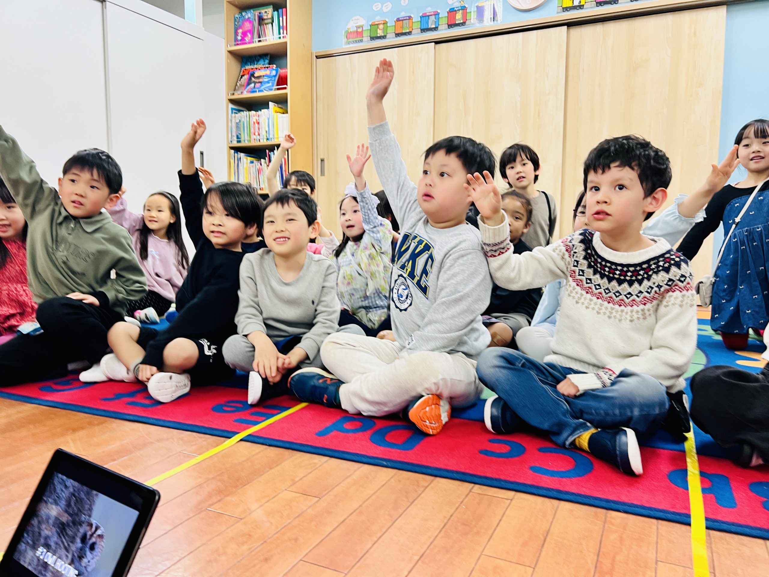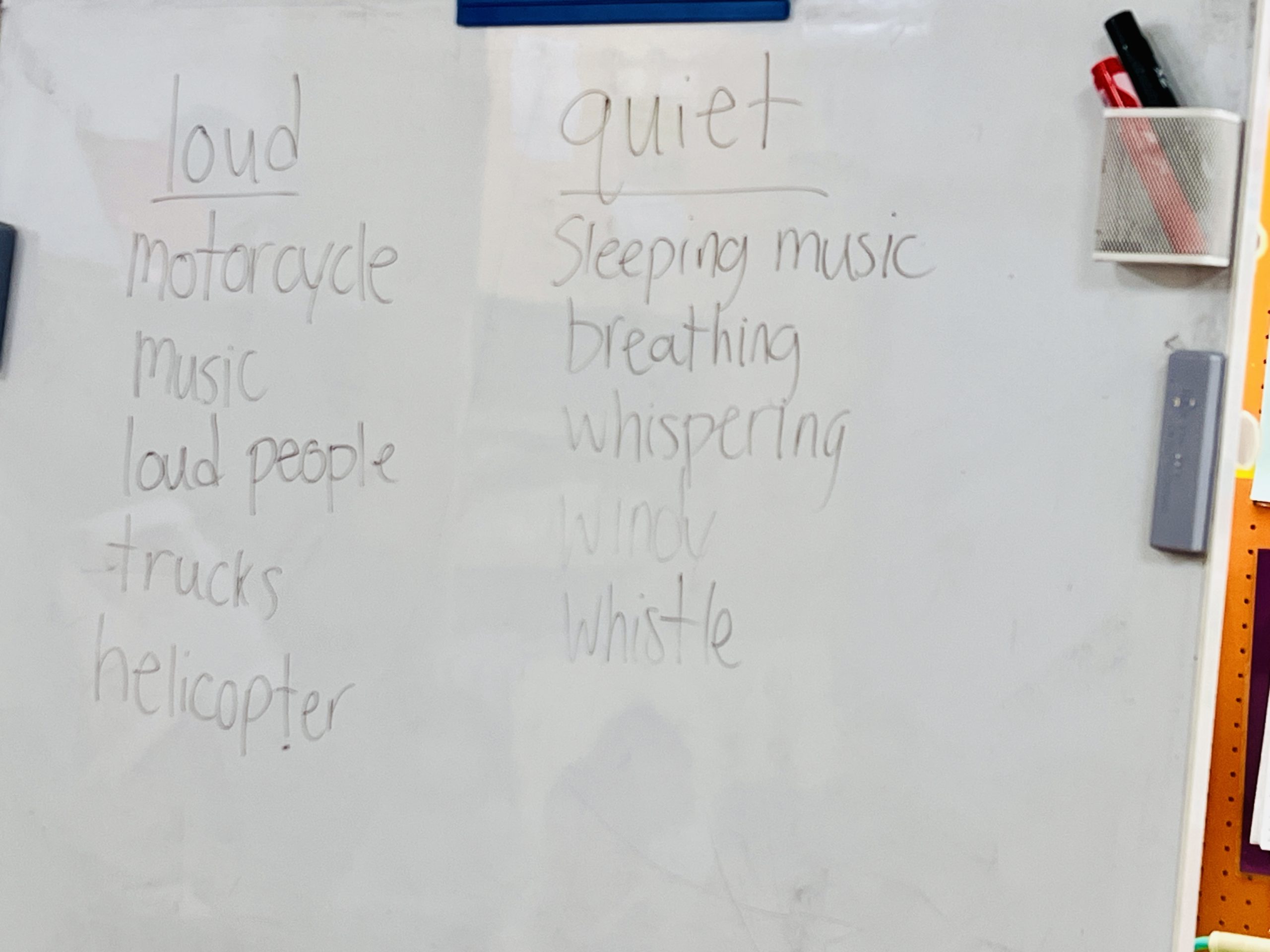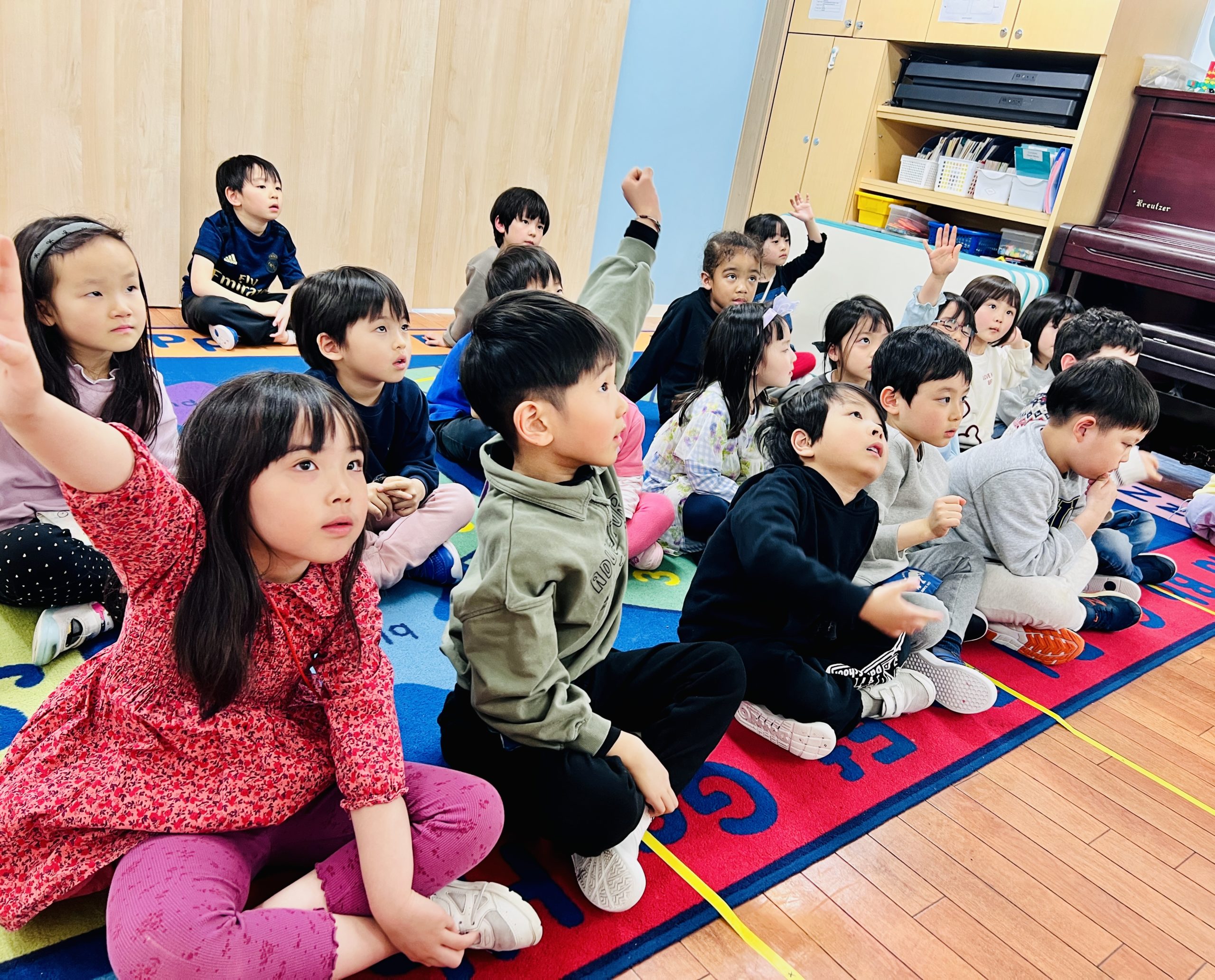 「大きな音(Loud sound)」と「小さな音(Quiet sound)」にはどんなものがあるかな?という問いかけに、「トラックは大きい!」「ひそひそ声は小さいね」と、みんな元気に意見を出し合いました。