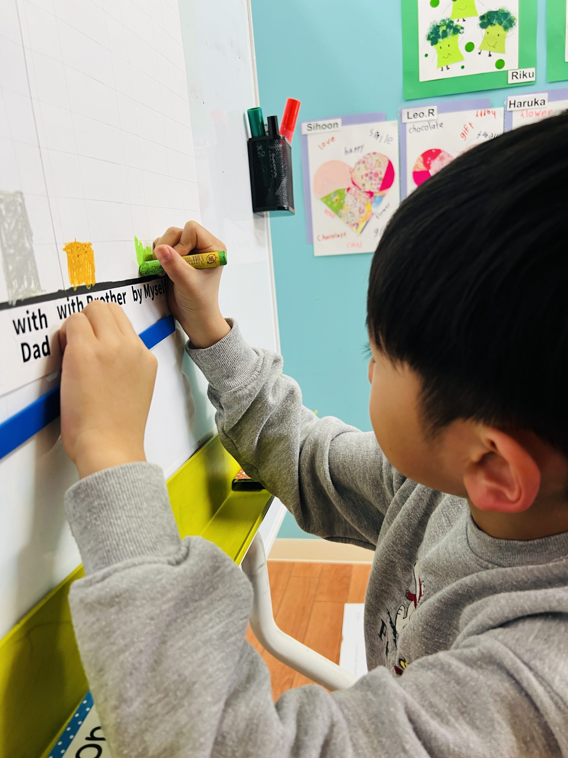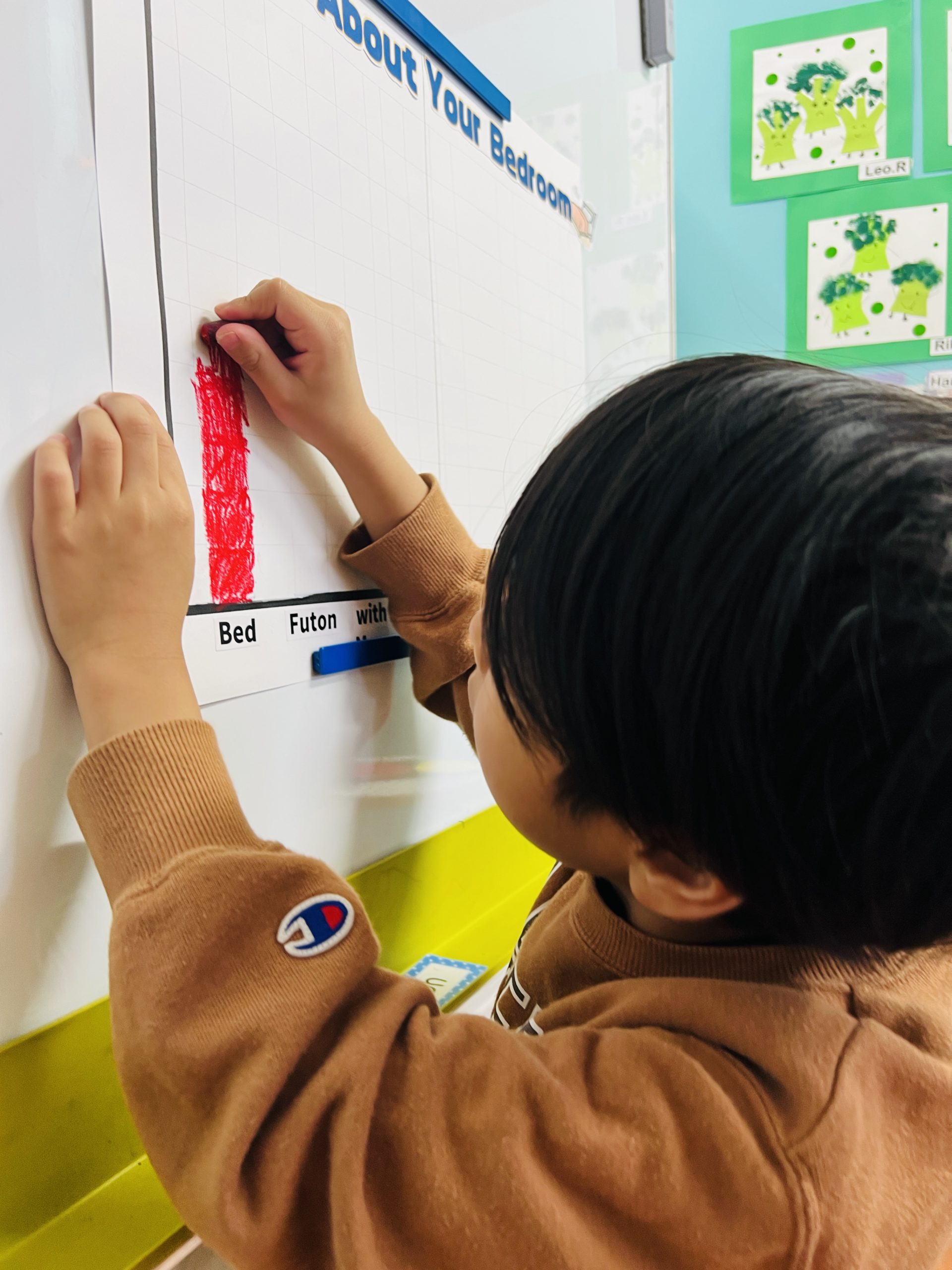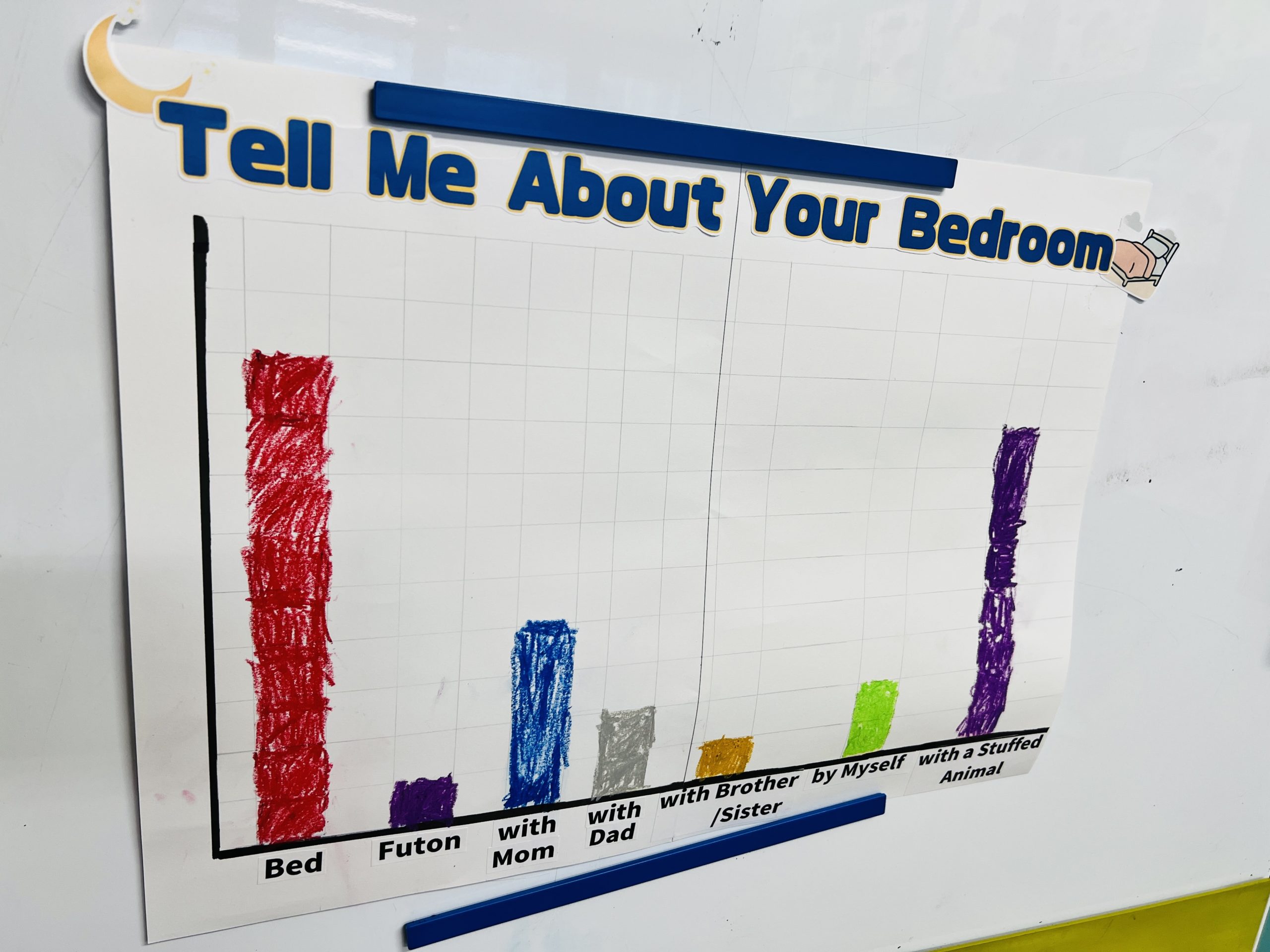 集まったデータをもとにチャート(表)を作ると、「えー!みんなお布団なんだ!」「一人で寝てるの、すごい!」と、お互いの生活スタイルの違いに驚きながら、楽しく完成させることができました。