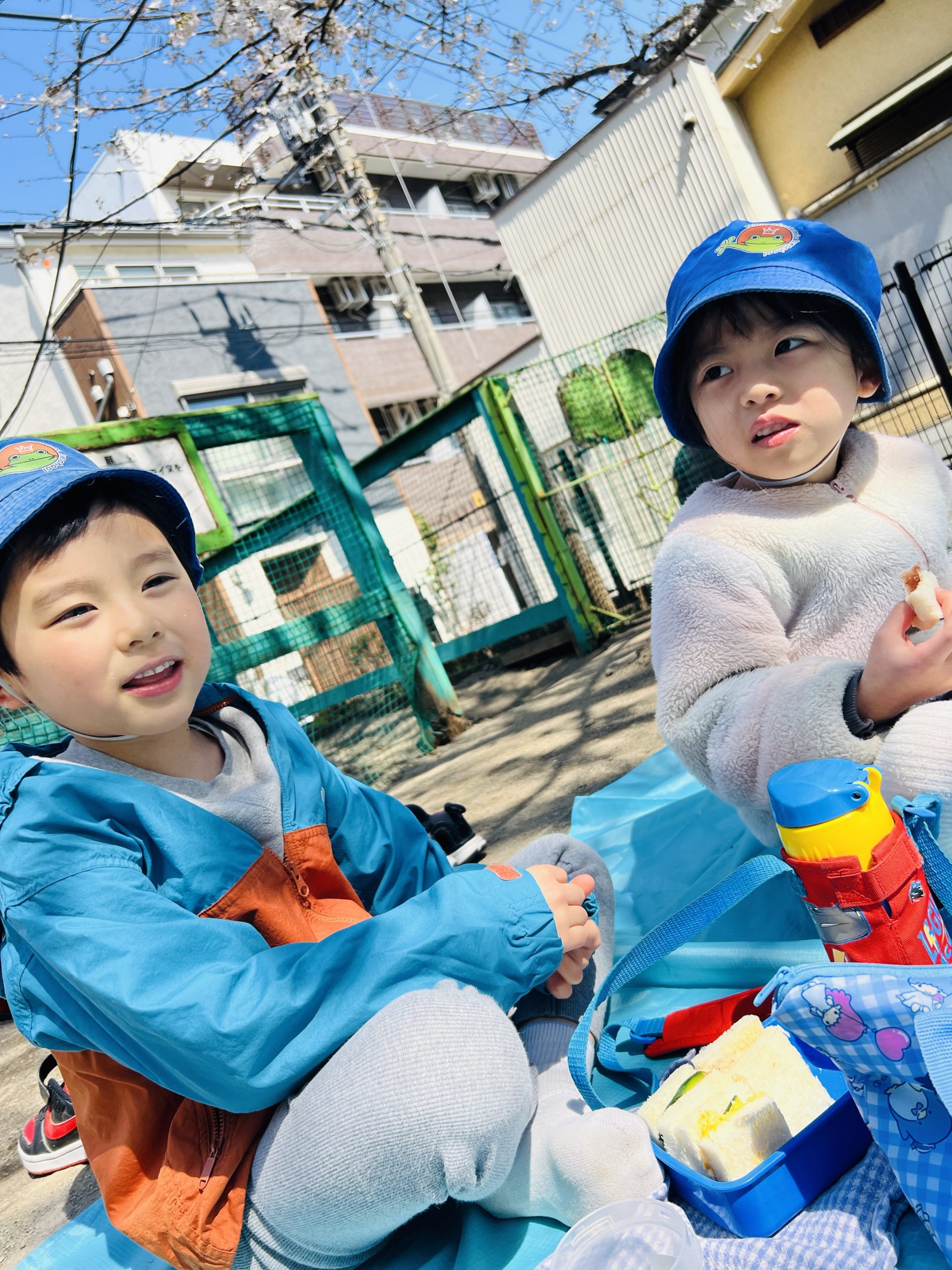 桜の木の下にシートを広げて、みんなで一緒にランチタイム!外の空気を感じながら、美しい景色に囲まれて食べるご飯は、いつもよりずっと特別で美味しく感じられたようです。
