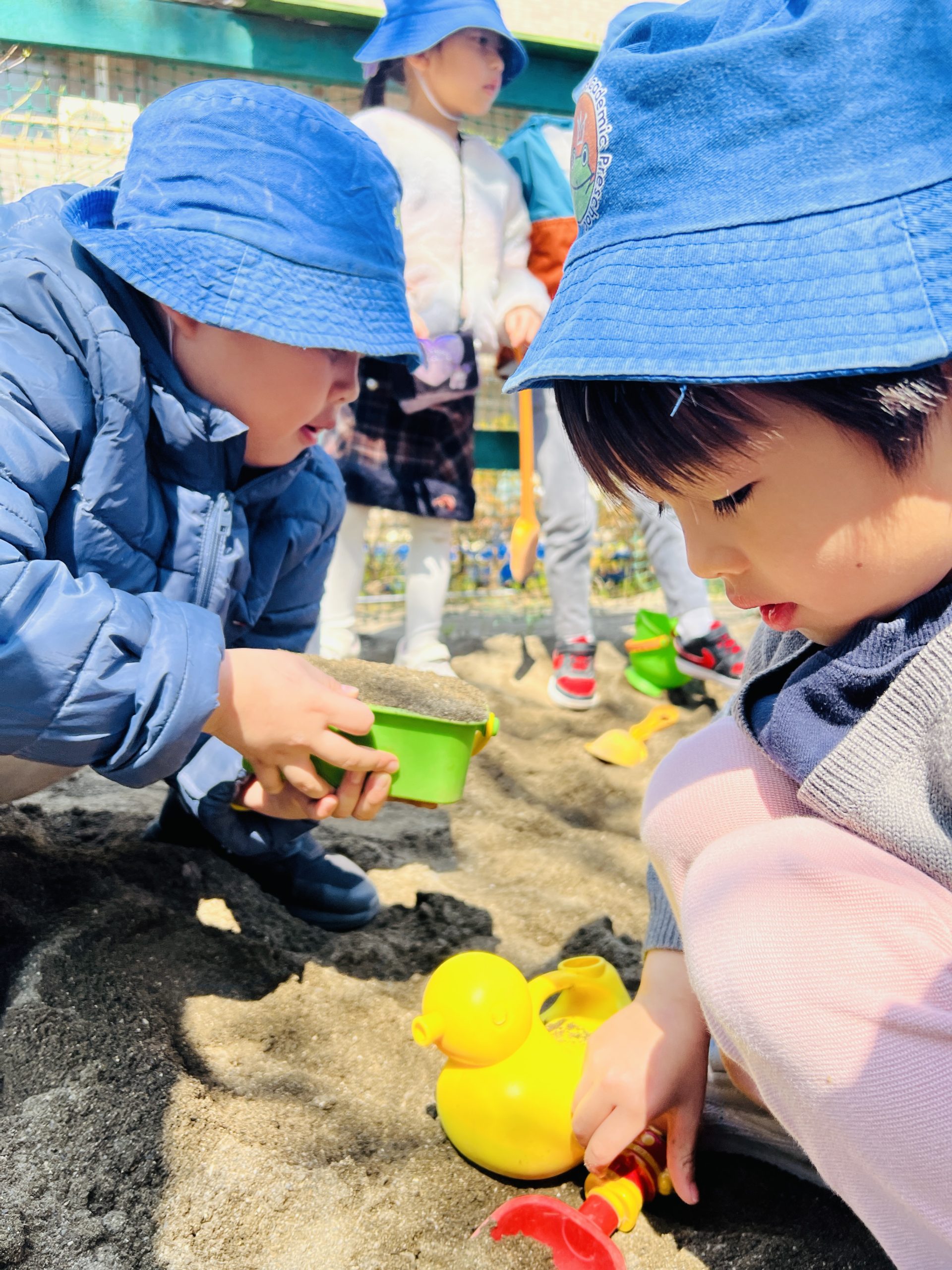 お腹がいっぱいになった後は、砂場で大きなお山を作ったり、ブランコを漕いだりと元気いっぱい遊びました。