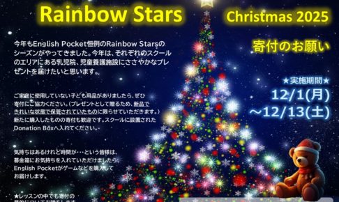 冬の訪れとともに、English Pocket恒例のチャリティーイベント「Rainbow Stars」の季節がやってきました! 毎年、皆様の温かいご協力に心から感謝しております。今年は、私たちのスクールがある地域の乳児院…